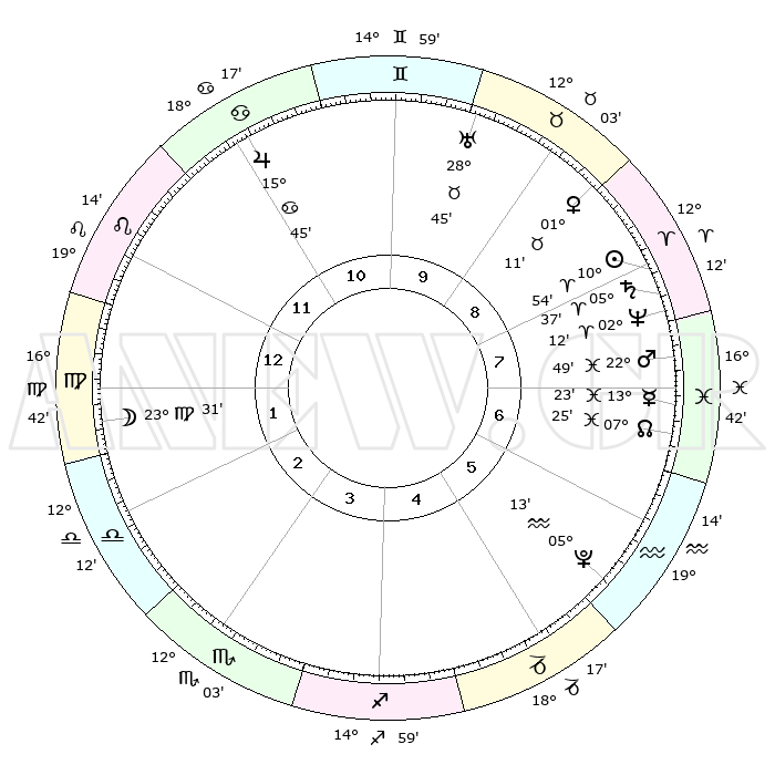 | | ΘΕΣΕΙΣ ΠΛΑΝΗΤΩΝ ΑΣΤΡΟΛΟΓΙΚΟΥ ΧΑΡΤΗ ΤΗΣ ΣΤΙΓΜΗΣ ΑΥΤΗΣ | | | | Πλανήτης | Ζώδιο | Μοίρες | Δεκαήμ. | Σε οίκο | Απόκλιση | | Ακμές των οίκων | | Ηλιος | Κριός | 10°50' | Δεύτερο | 8 | 04 N 17 | | 1ος | 28°49' | Λέων | | Σελήνη | Παρθένος | 22°44' | Τρίτο | 2 | 01 N 44 | | 2ος | 22°33' | Παρθένος | | Ερμής | Ιχθείς | 13°20' | Δεύτερο | 7 | 07 S 41 | | 3ος | 21°07' | Ζυγός | | Αφροδίτη | Ταύρος | 01°06' | Πρώτο | 9 | 11 N 25 | | 4ος | 24°01' | Σκορπιός | | Αρης | Ιχθείς | 22°47' | Τρίτο | 8 | 03 S 50 | | 5ος | 28°17' | Τοξότης | | Δίας | Καρκίνος | 15°45' | Δεύτερο | 11 | 22 N 52 | | 6ος | 00°20' | Υδροχόος | | Κρόνος | Κριός | 05°36' | Πρώτο | 8 | 00 N 16 | | 7ος | 28°49' | Υδροχόος | | Ουρανός | Ταύρος | 28°45' | Τρίτο | 10 | 19 N 42 | | 8ος | 22°33' | Ιχθείς | | Ποσειδώνας | Κριός | 02°12' | Πρώτο | 8 | 00 S 20 | | 9ος | 21°07' | Κριός | | Πλούτωνας | Υδροχόος | 05°13' | Πρώτο | 6 | 22 S 47 | | 10ος | 24°01' | Ταύρος | | Β. Δεσμός | Ιχθείς | 07°26' | Πρώτο | 7 | 08 S 47 | | 11ος | 28°17' | Δίδυμοι | | Ωροσκόπος | Λέων | 28°49' | Τρίτο | | | 12ος | 00°20' | Λέων | | Μεσουράνημα | Ταύρος | 24°01' | Τρίτο | | | |