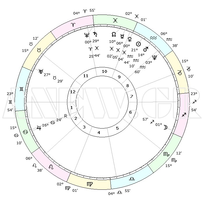 | | ΘΕΣΕΙΣ ΠΛΑΝΗΤΩΝ ΑΣΤΡΟΛΟΓΙΚΟΥ ΧΑΡΤΗ ΤΗΣ ΣΤΙΓΜΗΣ ΑΥΤΗΣ | | | | Πλανήτης | Ζώδιο | Μοίρες | Δεκαήμ. | Σε οίκο | Απόκλιση | | Ακμές των οίκων | | Ηλιος | Υδροχόος | 21°40' | Τρίτο | 10 | 14 S 17 | | 1ος | 01°30' | Δίδυμοι | | Σελήνη | Τοξότης | 01°15' | Πρώτο | 6 | 25 S 30 | | 2ος | 26°01' | Δίδυμοι | | Ερμής | Ιχθείς | 05°59' | Πρώτο | 10 | 10 S 05 | | 3ος | 17°23' | Καρκίνος | | Αφροδίτη | Υδροχόος | 29°59' | Τρίτο | 10 | 12 S 50 | | 4ος | 10°15' | Λέων | | Αρης | Υδροχόος | 14°07' | Δεύτερο | 10 | 17 S 37 | | 5ος | 08°59' | Παρθένος | | Δίας | Καρκίνος | 16°24'R | Δεύτερο | 2 | 22 N 45 | | 6ος | 17°39' | Ζυγός | | Κρόνος | Ιχθείς | 29°44' | Τρίτο | 11 | 02 S 05 | | 7ος | 01°30' | Τοξότης | | Ουρανός | Ταύρος | 27°29' | Τρίτο | 12 | 19 N 25 | | 8ος | 26°01' | Τοξότης | | Ποσειδώνας | Κριός | 00°25' | Πρώτο | 11 | 01 S 02 | | 9ος | 17°23' | Αιγόκερως | | Πλούτωνας | Υδροχόος | 03°60' | Πρώτο | 9 | 22 S 58 | | 10ος | 10°15' | Υδροχόος | | Β. Δεσμός | Ιχθείς | 10°02' | Δεύτερο | 11 | 07 S 48 | | 11ος | 08°59' | Ιχθείς | | Ωροσκόπος | Δίδυμοι | 01°30' | Πρώτο | | | 12ος | 17°39' | Κριός | | Μεσουράνημα | Υδροχόος | 10°15' | Δεύτερο | | | |