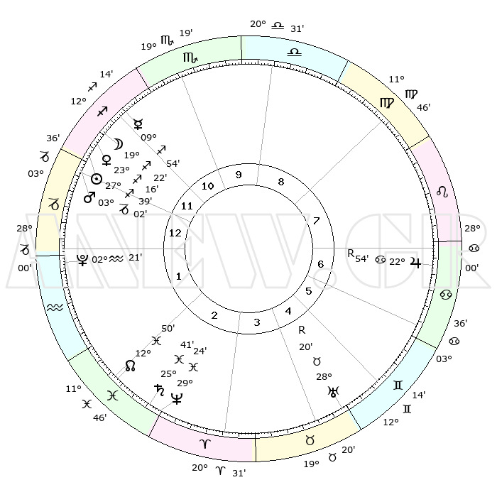 | | ΘΕΣΕΙΣ ΠΛΑΝΗΤΩΝ ΑΣΤΡΟΛΟΓΙΚΟΥ ΧΑΡΤΗ ΤΗΣ ΣΤΙΓΜΗΣ ΑΥΤΗΣ | | | | Πλανήτης | Ζώδιο | Μοίρες | Δεκαήμ. | Σε οίκο | Απόκλιση | | Ακμές των οίκων | | Ηλιος | Τοξότης | 27°19' | Τρίτο | 3 | 23 S 24 | | 1ος | 15°21' | Ζυγός | | Σελήνη | Τοξότης | 15°27' | Δεύτερο | 3 | 27 S 36 | | 2ος | 12°55' | Σκορπιός | | Ερμής | Τοξότης | 09°26' | Πρώτο | 2 | 20 S 51 | | 3ος | 13°58' | Τοξότης | | Αφροδίτη | Τοξότης | 22°51' | Τρίτο | 3 | 23 S 14 | | 4ος | 17°21' | Αιγόκερως | | Αρης | Αιγόκερως | 02°47' | Πρώτο | 3 | 24 S 12 | | 5ος | 20°17' | Υδροχόος | | Δίας | Καρκίνος | 22°56'R | Τρίτο | 10 | 21 N 41 | | 6ος | 20°01' | Ιχθείς | | Κρόνος | Ιχθείς | 25°40' | Τρίτο | 6 | 03 S 50 | | 7ος | 15°21' | Κριός | | Ουρανός | Ταύρος | 28°21'R | Τρίτο | 8 | 19 N 35 | | 8ος | 12°55' | Ταύρος | | Ποσειδώνας | Ιχθείς | 29°24' | Τρίτο | 6 | 01 S 28 | | 9ος | 13°58' | Δίδυμοι | | Πλούτωνας | Υδροχόος | 02°21' | Πρώτο | 4 | 23 S 18 | | 10ος | 17°21' | Καρκίνος | | Β. Δεσμός | Ιχθείς | 12°51' | Δεύτερο | 5 | 06 S 44 | | 11ος | 20°17' | Λέων | | Ωροσκόπος | Ζυγός | 15°21' | Δεύτερο | | | 12ος | 20°01' | Παρθένος | | Μεσουράνημα | Καρκίνος | 17°21' | Δεύτερο | | | |