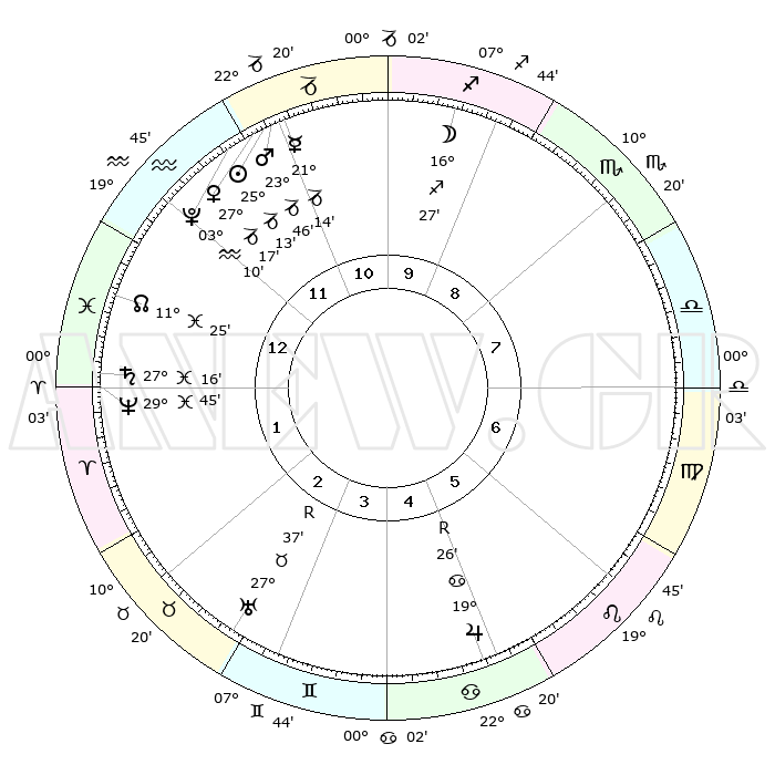 | | ΘΕΣΕΙΣ ΠΛΑΝΗΤΩΝ ΑΣΤΡΟΛΟΓΙΚΟΥ ΧΑΡΤΗ ΤΗΣ ΣΤΙΓΜΗΣ ΑΥΤΗΣ | | | | Πλανήτης | Ζώδιο | Μοίρες | Δεκαήμ. | Σε οίκο | Απόκλιση | | Ακμές των οίκων | | Ηλιος | Αιγόκερως | 25°08' | Τρίτο | 12 | 21 S 06 | | 1ος | 18°21' | Υδροχόος | | Σελήνη | Τοξότης | 15°33' | Δεύτερο | 10 | 27 S 43 | | 2ος | 04°09' | Κριός | | Ερμής | Αιγόκερως | 21°07' | Τρίτο | 12 | 23 S 33 | | 3ος | 09°12' | Ταύρος | | Αφροδίτη | Αιγόκερως | 27°12' | Τρίτο | 12 | 21 S 41 | | 4ος | 04°54' | Δίδυμοι | | Αρης | Αιγόκερως | 23°43' | Τρίτο | 12 | 22 S 19 | | 5ος | 26°46' | Δίδυμοι | | Δίας | Καρκίνος | 19°26'R | Δεύτερο | 6 | 22 N 18 | | 6ος | 19°16' | Καρκίνος | | Κρόνος | Ιχθείς | 27°16' | Τρίτο | 1 | 03 S 07 | | 7ος | 18°21' | Λέων | | Ουρανός | Ταύρος | 27°38'R | Τρίτο | 3 | 19 N 26 | | 8ος | 04°09' | Ζυγός | | Ποσειδώνας | Ιχθείς | 29°45' | Τρίτο | 1 | 01 S 19 | | 9ος | 09°12' | Σκορπιός | | Πλούτωνας | Υδροχόος | 03°10' | Πρώτο | 12 | 23 S 08 | | 10ος | 04°54' | Τοξότης | | Β. Δεσμός | Ιχθείς | 11°25' | Δεύτερο | 1 | 07 S 17 | | 11ος | 26°46' | Τοξότης | | Ωροσκόπος | Υδροχόος | 18°21' | Δεύτερο | | | 12ος | 19°16' | Αιγόκερως | | Μεσουράνημα | Τοξότης | 04°54' | Πρώτο | | | |
