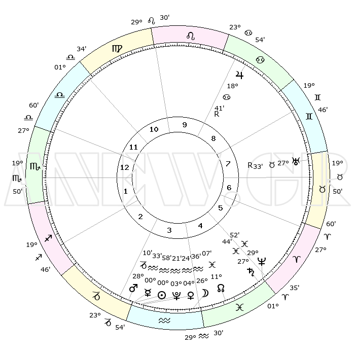 | | ΘΕΣΕΙΣ ΠΛΑΝΗΤΩΝ ΑΣΤΡΟΛΟΓΙΚΟΥ ΧΑΡΤΗ ΤΗΣ ΣΤΙΓΜΗΣ ΑΥΤΗΣ | | | | Πλανήτης | Ζώδιο | Μοίρες | Δεκαήμ. | Σε οίκο | Απόκλιση | | Ακμές των οίκων | | Ηλιος | Υδροχόος | 00°54' | Πρώτο | 3 | 19 S 57 | | 1ος | 28°42' | Ζυγός | | Σελήνη | Υδροχόος | 25°39' | Τρίτο | 4 | 14 S 07 | | 2ος | 27°02' | Σκορπιός | | Ερμής | Υδροχόος | 00°26' | Πρώτο | 3 | 22 S 03 | | 3ος | 28°53' | Τοξότης | | Αφροδίτη | Υδροχόος | 04°18' | Πρώτο | 4 | 20 S 17 | | 4ος | 02°60' | Υδροχόος | | Αρης | Αιγόκερως | 28°07' | Τρίτο | 3 | 21 S 31 | | 5ος | 05°55' | Ιχθείς | | Δίας | Καρκίνος | 18°42'R | Δεύτερο | 9 | 22 N 25 | | 6ος | 04°43' | Κριός | | Κρόνος | Ιχθείς | 27°44' | Τρίτο | 5 | 02 S 55 | | 7ος | 28°42' | Κριός | | Ουρανός | Ταύρος | 27°33'R | Τρίτο | 8 | 19 N 25 | | 8ος | 27°02' | Ταύρος | | Ποσειδώνας | Ιχθείς | 29°52' | Τρίτο | 5 | 01 S 16 | | 9ος | 28°53' | Δίδυμοι | | Πλούτωνας | Υδροχόος | 03°21' | Πρώτο | 4 | 23 S 05 | | 10ος | 02°60' | Λέων | | Β. Δεσμός | Ιχθείς | 11°07' | Δεύτερο | 5 | 07 S 24 | | 11ος | 05°55' | Παρθένος | | Ωροσκόπος | Ζυγός | 28°42' | Τρίτο | | | 12ος | 04°43' | Ζυγός | | Μεσουράνημα | Λέων | 02°60' | Πρώτο | | | |
