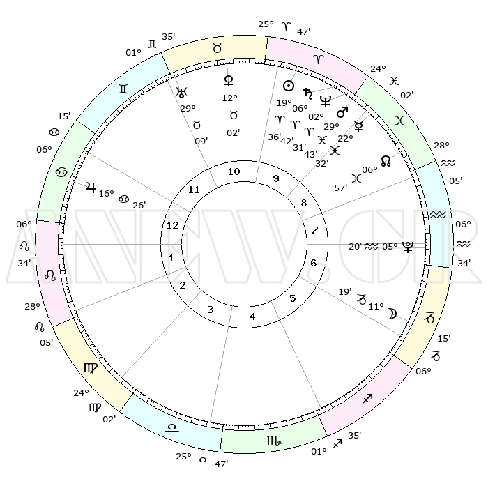 | | ΘΕΣΕΙΣ ΠΛΑΝΗΤΩΝ ΑΣΤΡΟΛΟΓΙΚΟΥ ΧΑΡΤΗ ΤΗΣ ΣΤΙΓΜΗΣ ΑΥΤΗΣ | | | | Πλανήτης | Ζώδιο | Μοίρες | Δεκαήμ. | Σε οίκο | Απόκλιση | | Ακμές των οίκων | | Ηλιος | Κριός | 19°32' | Δεύτερο | 10 | 07 N 39 | | 1ος | 16°41' | Καρκίνος | | Σελήνη | Αιγόκερως | 10°30' | Δεύτερο | 6 | 27 S 22 | | 2ος | 07°08' | Λέων | | Ερμής | Ιχθείς | 22°27' | Τρίτο | 9 | 05 S 06 | | 3ος | 00°29' | Παρθένος | | Αφροδίτη | Ταύρος | 11°57' | Δεύτερο | 11 | 15 N 20 | | 4ος | 29°33' | Παρθένος | | Αρης | Ιχθείς | 29°40' | Τρίτο | 10 | 01 S 03 | | 5ος | 05°23' | Σκορπιός | | Δίας | Καρκίνος | 16°26' | Δεύτερο | 12 | 22 N 48 | | 6ος | 13°19' | Τοξότης | | Κρόνος | Κριός | 06°42' | Πρώτο | 10 | 00 N 42 | | 7ος | 16°41' | Αιγόκερως | | Ουρανός | Ταύρος | 29°09' | Τρίτο | 11 | 19 N 48 | | 8ος | 07°08' | Υδροχόος | | Ποσειδώνας | Κριός | 02°31' | Πρώτο | 10 | 00 S 12 | | 9ος | 00°29' | Ιχθείς | | Πλούτωνας | Υδροχόος | 05°20' | Πρώτο | 7 | 22 S 47 | | 10ος | 29°33' | Ιχθείς | | Β. Δεσμός | Ιχθείς | 06°58' | Πρώτο | 9 | 08 S 57 | | 11ος | 05°23' | Ταύρος | | Ωροσκόπος | Καρκίνος | 16°41' | Δεύτερο | | | 12ος | 13°20' | Δίδυμοι | | Μεσουράνημα | Ιχθείς | 29°33' | Τρίτο | | | |