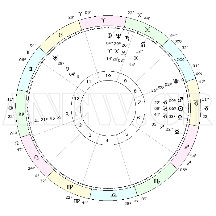 | | ΘΕΣΕΙΣ ΠΛΑΝΗΤΩΝ ΑΣΤΡΟΛΟΓΙΚΟΥ ΧΑΡΤΗ ΤΗΣ ΣΤΙΓΜΗΣ ΑΥΤΗΣ | | | | Πλανήτης | Ζώδιο | Μοίρες | Δεκαήμ. | Σε οίκο | Απόκλιση | | Ακμές των οίκων | | Ηλιος | Αιγόκερως | 06°03' | Πρώτο | 7 | 23 S 18 | | 1ος | 15°13' | Δίδυμοι | | Σελήνη | Κριός | 03°10' | Πρώτο | 11 | 03 N 00 | | 2ος | 07°27' | Καρκίνος | | Ερμής | Τοξότης | 21°58' | Τρίτο | 7 | 23 S 15 | | 3ος | 28°41' | Καρκίνος | | Αφροδίτη | Αιγόκερως | 03°39' | Πρώτο | 7 | 23 S 43 | | 4ος | 22°55' | Λέων | | Αρης | Αιγόκερως | 09°19' | Πρώτο | 8 | 23 S 58 | | 5ος | 24°11' | Παρθένος | | Δίας | Καρκίνος | 21°55'R | Τρίτο | 2 | 21 N 52 | | 6ος | 04°19' | Σκορπιός | | Κρόνος | Ιχθείς | 26°03' | Τρίτο | 11 | 03 S 40 | | 7ος | 15°13' | Τοξότης | | Ουρανός | Ταύρος | 28°04'R | Τρίτο | 12 | 19 N 32 | | 8ος | 07°27' | Αιγόκερως | | Ποσειδώνας | Ιχθείς | 29°27' | Τρίτο | 11 | 01 S 26 | | 9ος | 28°41' | Αιγόκερως | | Πλούτωνας | Υδροχόος | 02°35' | Πρώτο | 9 | 23 S 15 | | 10ος | 22°55' | Υδροχόος | | Β. Δεσμός | Ιχθείς | 12°24' | Δεύτερο | 10 | 06 S 54 | | 11ος | 24°11' | Ιχθείς | | Ωροσκόπος | Δίδυμοι | 15°13' | Δεύτερο | | | 12ος | 04°19' | Ταύρος | | Μεσουράνημα | Υδροχόος | 22°55' | Τρίτο | | | |