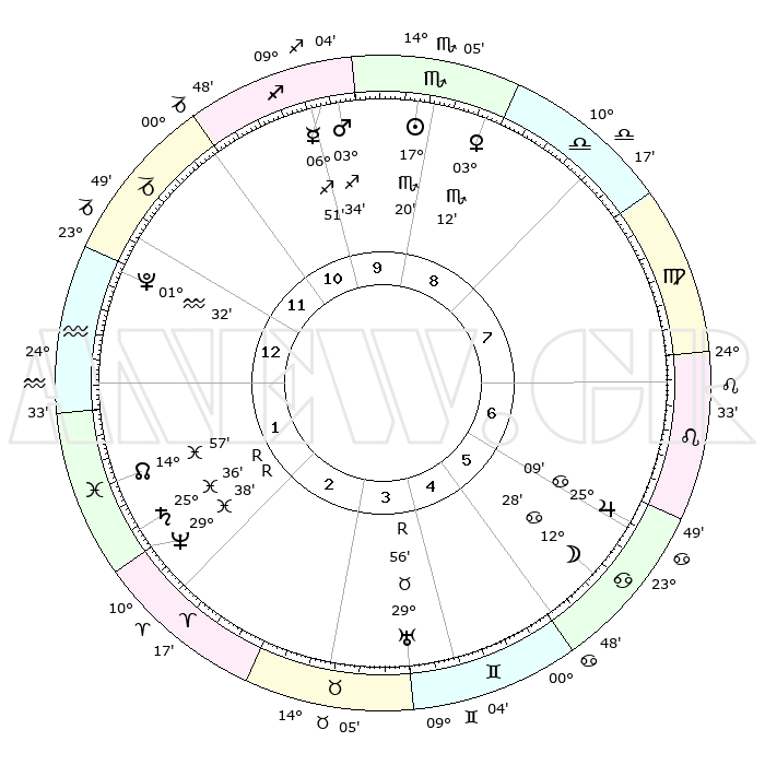 | | ΘΕΣΕΙΣ ΠΛΑΝΗΤΩΝ ΑΣΤΡΟΛΟΓΙΚΟΥ ΧΑΡΤΗ ΤΗΣ ΣΤΙΓΜΗΣ ΑΥΤΗΣ | | | | Πλανήτης | Ζώδιο | Μοίρες | Δεκαήμ. | Σε οίκο | Απόκλιση | | Ακμές των οίκων | | Ηλιος | Σκορπιός | 16°15' | Δεύτερο | 10 | 16 S 42 | | 1ος | 19°18' | Αιγόκερως | | Σελήνη | Δίδυμοι | 26°43' | Τρίτο | 6 | 28 N 23 | | 2ος | 01°16' | Ιχθείς | | Ερμής | Τοξότης | 06°44' | Πρώτο | 11 | 23 S 56 | | 3ος | 11°04' | Κριός | | Αφροδίτη | Σκορπιός | 01°51' | Πρώτο | 9 | 10 S 50 | | 4ος | 11°29' | Ταύρος | | Αρης | Τοξότης | 02°47' | Πρώτο | 10 | 21 S 10 | | 5ος | 05°12' | Δίδυμοι | | Δίας | Καρκίνος | 25°08' | Τρίτο | 7 | 21 N 12 | | 6ος | 26°25' | Δίδυμοι | | Κρόνος | Ιχθείς | 25°38'R | Τρίτο | 2 | 03 S 59 | | 7ος | 19°18' | Καρκίνος | | Ουρανός | Ταύρος | 29°59'R | Τρίτο | 4 | 19 N 56 | | 8ος | 01°17' | Παρθένος | | Ποσειδώνας | Ιχθείς | 29°39'R | Τρίτο | 2 | 01 S 23 | | 9ος | 11°04' | Ζυγός | | Πλούτωνας | Υδροχόος | 01°31' | Πρώτο | 1 | 23 S 30 | | 10ος | 11°29' | Σκορπιός | | Β. Δεσμός | Ιχθείς | 15°00' | Δεύτερο | 2 | 05 S 54 | | 11ος | 05°12' | Τοξότης | | Ωροσκόπος | Αιγόκερως | 19°18' | Δεύτερο | | | 12ος | 26°25' | Τοξότης | | Μεσουράνημα | Σκορπιός | 11°29' | Δεύτερο | | | |