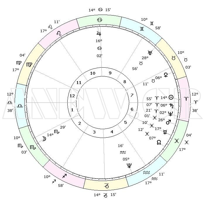 | | ΘΕΣΕΙΣ ΠΛΑΝΗΤΩΝ ΑΣΤΡΟΛΟΓΙΚΟΥ ΧΑΡΤΗ ΤΗΣ ΣΤΙΓΜΗΣ ΑΥΤΗΣ | | | | Πλανήτης | Ζώδιο | Μοίρες | Δεκαήμ. | Σε οίκο | Απόκλιση | | Ακμές των οίκων | | Ηλιος | Κριός | 14°50' | Δεύτερο | 8 | 05 N 51 | | 1ος | 17°15' | Παρθένος | | Σελήνη | Σκορπιός | 13°26' | Δεύτερο | 3 | 20 S 20 | | 2ος | 12°48' | Ζυγός | | Ερμής | Ιχθείς | 17°05' | Δεύτερο | 6 | 06 S 46 | | 3ος | 12°41' | Σκορπιός | | Αφροδίτη | Ταύρος | 06°05' | Πρώτο | 8 | 13 N 16 | | 4ος | 15°37' | Τοξότης | | Αρης | Ιχθείς | 25°57' | Τρίτο | 7 | 02 S 33 | | 5ος | 18°53' | Αιγόκερως | | Δίας | Καρκίνος | 16°02' | Δεύτερο | 10 | 22 N 50 | | 6ος | 19°50' | Υδροχόος | | Κρόνος | Κριός | 06°07' | Πρώτο | 7 | 00 N 28 | | 7ος | 17°15' | Ιχθείς | | Ουρανός | Ταύρος | 28°55' | Τρίτο | 9 | 19 N 45 | | 8ος | 12°48' | Κριός | | Ποσειδώνας | Κριός | 02°21' | Πρώτο | 7 | 00 S 16 | | 9ος | 12°41' | Ταύρος | | Πλούτωνας | Υδροχόος | 05°16' | Πρώτο | 5 | 22 S 47 | | 10ος | 15°37' | Δίδυμοι | | Β. Δεσμός | Ιχθείς | 07°13' | Πρώτο | 6 | 08 S 52 | | 11ος | 18°53' | Καρκίνος | | Ωροσκόπος | Παρθένος | 17°15' | Δεύτερο | | | 12ος | 19°50' | Λέων | | Μεσουράνημα | Δίδυμοι | 15°37' | Δεύτερο | | | |