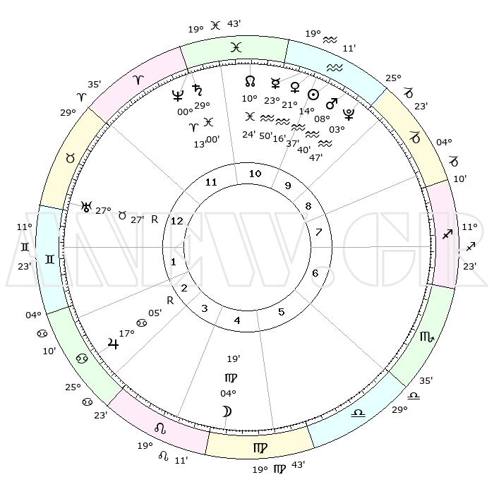 | | ΘΕΣΕΙΣ ΠΛΑΝΗΤΩΝ ΑΣΤΡΟΛΟΓΙΚΟΥ ΧΑΡΤΗ ΤΗΣ ΣΤΙΓΜΗΣ ΑΥΤΗΣ | | | | Πλανήτης | Ζώδιο | Μοίρες | Δεκαήμ. | Σε οίκο | Απόκλιση | | Ακμές των οίκων | | Ηλιος | Υδροχόος | 14°33' | Δεύτερο | 10 | 16 S 28 | | 1ος | 11°17' | Ταύρος | | Σελήνη | Παρθένος | 03°23' | Πρώτο | 5 | 10 N 45 | | 2ος | 10°28' | Δίδυμοι | | Ερμής | Υδροχόος | 23°43' | Τρίτο | 11 | 15 S 14 | | 3ος | 02°60' | Καρκίνος | | Αφροδίτη | Υδροχόος | 21°11' | Τρίτο | 11 | 15 S 45 | | 4ος | 24°51' | Καρκίνος | | Αρης | Υδροχόος | 08°36' | Πρώτο | 10 | 19 S 07 | | 5ος | 20°31' | Λέων | | Δίας | Καρκίνος | 17°06'R | Δεύτερο | 3 | 22 N 39 | | 6ος | 25°29' | Παρθένος | | Κρόνος | Ιχθείς | 28°60' | Τρίτο | 12 | 02 S 23 | | 7ος | 11°17' | Σκορπιός | | Ουρανός | Ταύρος | 27°27'R | Τρίτο | 1 | 19 N 24 | | 8ος | 10°28' | Τοξότης | | Ποσειδώνας | Κριός | 00°13' | Πρώτο | 12 | 01 S 07 | | 9ος | 02°60' | Αιγόκερως | | Πλούτωνας | Υδροχόος | 03°47' | Πρώτο | 10 | 23 S 00 | | 10ος | 24°51' | Αιγόκερως | | Β. Δεσμός | Ιχθείς | 10°24' | Δεύτερο | 11 | 07 S 40 | | 11ος | 20°31' | Υδροχόος | | Ωροσκόπος | Ταύρος | 11°17' | Δεύτερο | | | 12ος | 25°29' | Ιχθείς | | Μεσουράνημα | Αιγόκερως | 24°51' | Τρίτο | | | |