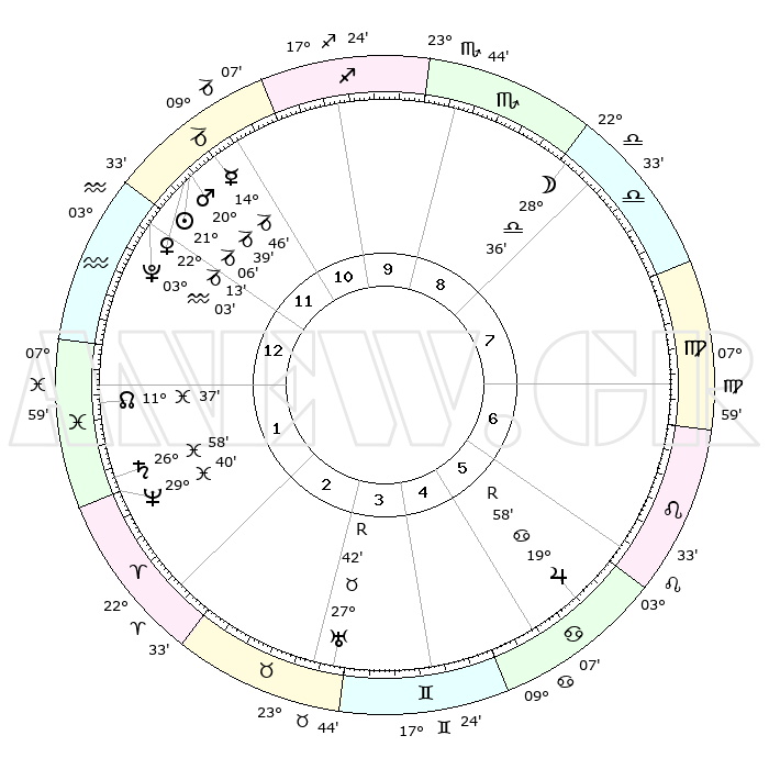 | | ΘΕΣΕΙΣ ΠΛΑΝΗΤΩΝ ΑΣΤΡΟΛΟΓΙΚΟΥ ΧΑΡΤΗ ΤΗΣ ΣΤΙΓΜΗΣ ΑΥΤΗΣ | | | | Πλανήτης | Ζώδιο | Μοίρες | Δεκαήμ. | Σε οίκο | Απόκλιση | | Ακμές των οίκων | | Ηλιος | Αιγόκερως | 20°39' | Τρίτο | 4 | 21 S 51 | | 1ος | 04°36' | Ζυγός | | Σελήνη | Ζυγός | 23°15' | Τρίτο | 1 | 12 S 17 | | 2ος | 01°30' | Σκορπιός | | Ερμής | Αιγόκερως | 14°03' | Δεύτερο | 4 | 24 S 11 | | 3ος | 02°07' | Τοξότης | | Αφροδίτη | Αιγόκερως | 21°40' | Τρίτο | 4 | 22 S 32 | | 4ος | 05°10' | Αιγόκερως | | Αρης | Αιγόκερως | 20°19' | Τρίτο | 4 | 22 S 50 | | 5ος | 08°06' | Υδροχόος | | Δίας | Καρκίνος | 20°02'R | Τρίτο | 10 | 22 N 12 | | 6ος | 08°21' | Ιχθείς | | Κρόνος | Ιχθείς | 26°56' | Τρίτο | 6 | 03 S 16 | | 7ος | 04°36' | Κριός | | Ουρανός | Ταύρος | 27°42'R | Τρίτο | 8 | 19 N 27 | | 8ος | 01°30' | Ταύρος | | Ποσειδώνας | Ιχθείς | 29°39' | Τρίτο | 6 | 01 S 21 | | 9ος | 02°07' | Δίδυμοι | | Πλούτωνας | Υδροχόος | 03°02' | Πρώτο | 4 | 23 S 09 | | 10ος | 05°10' | Καρκίνος | | Β. Δεσμός | Ιχθείς | 11°39' | Δεύτερο | 6 | 07 S 12 | | 11ος | 08°06' | Λέων | | Ωροσκόπος | Ζυγός | 04°36' | Πρώτο | | | 12ος | 08°21' | Παρθένος | | Μεσουράνημα | Καρκίνος | 05°10' | Πρώτο | | | |