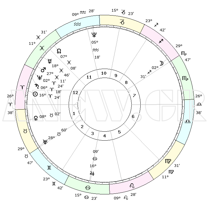 | | ΘΕΣΕΙΣ ΠΛΑΝΗΤΩΝ ΑΣΤΡΟΛΟΓΙΚΟΥ ΧΑΡΤΗ ΤΗΣ ΣΤΙΓΜΗΣ ΑΥΤΗΣ | | | | Πλανήτης | Ζώδιο | Μοίρες | Δεκαήμ. | Σε οίκο | Απόκλιση | | Ακμές των οίκων | | Ηλιος | Κριός | 16°20' | Δεύτερο | 1 | 06 N 25 | | 1ος | 17°12' | Ιχθείς | | Σελήνη | Τοξότης | 01°43' | Πρώτο | 9 | 25 S 31 | | 2ος | 00°16' | Ταύρος | | Ερμής | Ιχθείς | 18°41' | Δεύτερο | 1 | 06 S 18 | | 3ος | 29°46' | Ταύρος | | Αφροδίτη | Ταύρος | 07°57' | Πρώτο | 2 | 13 N 57 | | 4ος | 22°46' | Δίδυμοι | | Αρης | Ιχθείς | 27°08' | Τρίτο | 1 | 02 S 05 | | 5ος | 14°38' | Καρκίνος | | Δίας | Καρκίνος | 16°09' | Δεύτερο | 5 | 22 N 50 | | 6ος | 10°13' | Λέων | | Κρόνος | Κριός | 06°18' | Πρώτο | 1 | 00 N 32 | | 7ος | 17°12' | Παρθένος | | Ουρανός | Ταύρος | 28°60' | Τρίτο | 2 | 19 N 46 | | 8ος | 00°16' | Σκορπιός | | Ποσειδώνας | Κριός | 02°24' | Πρώτο | 1 | 00 S 15 | | 9ος | 29°46' | Σκορπιός | | Πλούτωνας | Υδροχόος | 05°18' | Πρώτο | 11 | 22 S 47 | | 10ος | 22°46' | Τοξότης | | Β. Δεσμός | Ιχθείς | 07°08' | Πρώτο | 12 | 08 S 53 | | 11ος | 14°38' | Αιγόκερως | | Ωροσκόπος | Ιχθείς | 17°12' | Δεύτερο | | | 12ος | 10°13' | Υδροχόος | | Μεσουράνημα | Τοξότης | 22°46' | Τρίτο | | | |