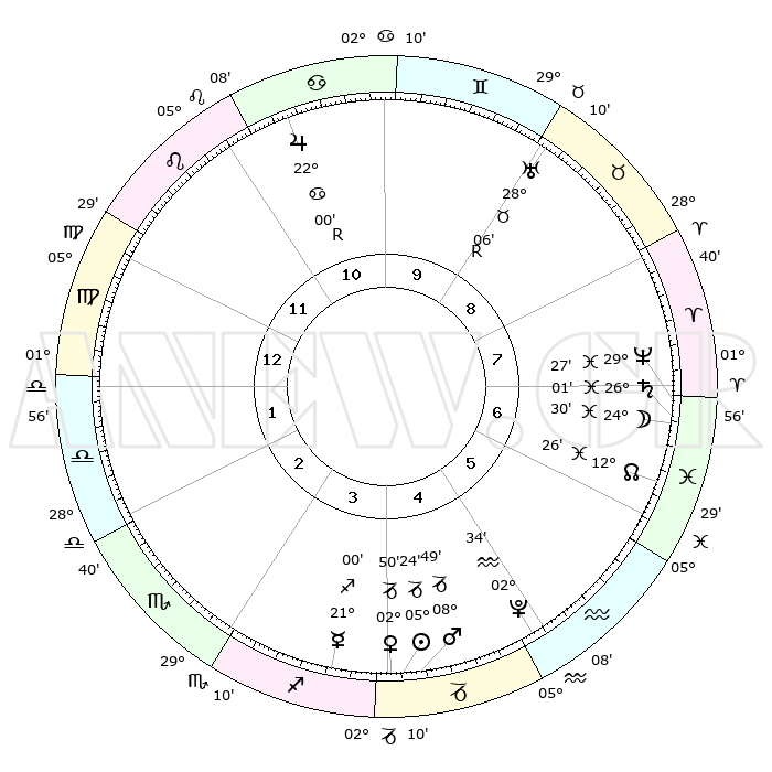 | | ΘΕΣΕΙΣ ΠΛΑΝΗΤΩΝ ΑΣΤΡΟΛΟΓΙΚΟΥ ΧΑΡΤΗ ΤΗΣ ΣΤΙΓΜΗΣ ΑΥΤΗΣ | | | | Πλανήτης | Ζώδιο | Μοίρες | Δεκαήμ. | Σε οίκο | Απόκλιση | | Ακμές των οίκων | | Ηλιος | Αιγόκερως | 05°19' | Πρώτο | 4 | 23 S 20 | | 1ος | 10°04' | Παρθένος | | Σελήνη | Ιχθείς | 23°31' | Τρίτο | 7 | 01 S 35 | | 2ος | 04°57' | Ζυγός | | Ερμής | Τοξότης | 20°53' | Τρίτο | 4 | 23 S 05 | | 3ος | 04°24' | Σκορπιός | | Αφροδίτη | Αιγόκερως | 02°44' | Πρώτο | 4 | 23 S 43 | | 4ος | 07°21' | Τοξότης | | Αρης | Αιγόκερως | 08°46' | Πρώτο | 4 | 24 S 00 | | 5ος | 10°56' | Αιγόκερως | | Δίας | Καρκίνος | 22°01'R | Τρίτο | 11 | 21 N 51 | | 6ος | 12°14' | Υδροχόος | | Κρόνος | Ιχθείς | 26°00' | Τρίτο | 7 | 03 S 41 | | 7ος | 10°04' | Ιχθείς | | Ουρανός | Ταύρος | 28°06'R | Τρίτο | 9 | 19 N 32 | | 8ος | 04°57' | Κριός | | Ποσειδώνας | Ιχθείς | 29°27' | Τρίτο | 7 | 01 S 27 | | 9ος | 04°24' | Ταύρος | | Πλούτωνας | Υδροχόος | 02°34' | Πρώτο | 5 | 23 S 15 | | 10ος | 07°21' | Δίδυμοι | | Β. Δεσμός | Ιχθείς | 12°27' | Δεύτερο | 7 | 06 S 53 | | 11ος | 10°56' | Καρκίνος | | Ωροσκόπος | Παρθένος | 10°04' | Δεύτερο | | | 12ος | 12°14' | Λέων | | Μεσουράνημα | Δίδυμοι | 07°21' | Πρώτο | | | |