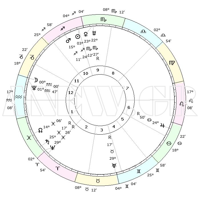 | | ΘΕΣΕΙΣ ΠΛΑΝΗΤΩΝ ΑΣΤΡΟΛΟΓΙΚΟΥ ΧΑΡΤΗ ΤΗΣ ΣΤΙΓΜΗΣ ΑΥΤΗΣ | | | | Πλανήτης | Ζώδιο | Μοίρες | Δεκαήμ. | Σε οίκο | Απόκλιση | | Ακμές των οίκων | | Ηλιος | Τοξότης | 03°18' | Πρώτο | 11 | 20 S 49 | | 1ος | 09°15' | Αιγόκερως | | Σελήνη | Αιγόκερως | 28°53' | Τρίτο | 1 | 23 S 53 | | 2ος | 18°46' | Υδροχόος | | Ερμής | Σκορπιός | 22°32'R | Τρίτο | 10 | 16 S 30 | | 3ος | 29°04' | Ιχθείς | | Αφροδίτη | Σκορπιός | 23°05' | Τρίτο | 10 | 17 S 40 | | 4ος | 01°23' | Ταύρος | | Αρης | Τοξότης | 15°07' | Δεύτερο | 11 | 23 S 13 | | 5ος | 26°20' | Ταύρος | | Δίας | Καρκίνος | 24°50'R | Τρίτο | 7 | 21 N 18 | | 6ος | 17°41' | Δίδυμοι | | Κρόνος | Ιχθείς | 25°17'R | Τρίτο | 2 | 04 S 04 | | 7ος | 09°15' | Καρκίνος | | Ουρανός | Ταύρος | 29°17'R | Τρίτο | 5 | 19 N 47 | | 8ος | 18°46' | Λέων | | Ποσειδώνας | Ιχθείς | 29°26'R | Τρίτο | 3 | 01 S 28 | | 9ος | 29°04' | Παρθένος | | Πλούτωνας | Υδροχόος | 01°47' | Πρώτο | 1 | 23 S 26 | | 10ος | 01°23' | Σκορπιός | | Β. Δεσμός | Ιχθείς | 14°07' | Δεύτερο | 2 | 06 S 15 | | 11ος | 26°20' | Σκορπιός | | Ωροσκόπος | Αιγόκερως | 09°15' | Πρώτο | | | 12ος | 17°41' | Τοξότης | | Μεσουράνημα | Σκορπιός | 01°23' | Πρώτο | | | |