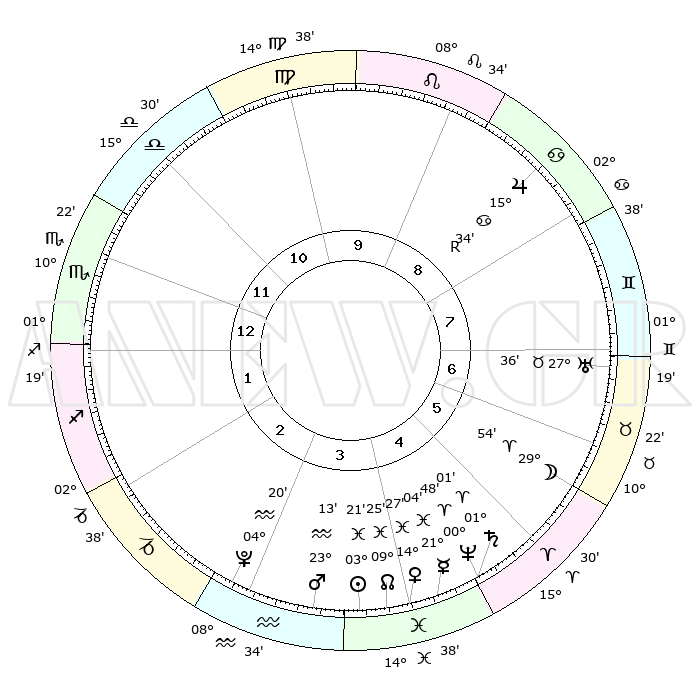 | | ΘΕΣΕΙΣ ΠΛΑΝΗΤΩΝ ΑΣΤΡΟΛΟΓΙΚΟΥ ΧΑΡΤΗ ΤΗΣ ΣΤΙΓΜΗΣ ΑΥΤΗΣ | | | | Πλανήτης | Ζώδιο | Μοίρες | Δεκαήμ. | Σε οίκο | Απόκλιση | | Ακμές των οίκων | | Ηλιος | Ιχθείς | 03°16' | Πρώτο | 4 | 10 S 18 | | 1ος | 06°56' | Σκορπιός | | Σελήνη | Κριός | 28°43' | Τρίτο | 6 | 14 N 47 | | 2ος | 05°48' | Τοξότης | | Ερμής | Ιχθείς | 21°00' | Τρίτο | 5 | 01 S 58 | | 3ος | 08°22' | Αιγόκερως | | Αφροδίτη | Ιχθείς | 14°21' | Δεύτερο | 4 | 07 S 29 | | 4ος | 13°03' | Υδροχόος | | Αρης | Υδροχόος | 23°09' | Τρίτο | 4 | 14 S 50 | | 5ος | 15°50' | Ιχθείς | | Δίας | Καρκίνος | 15°34'R | Δεύτερο | 9 | 22 N 51 | | 6ος | 13°49' | Κριός | | Κρόνος | Κριός | 01°00' | Πρώτο | 5 | 01 S 34 | | 7ος | 06°56' | Ταύρος | | Ουρανός | Ταύρος | 27°36' | Τρίτο | 7 | 19 N 27 | | 8ος | 05°48' | Δίδυμοι | | Ποσειδώνας | Κριός | 00°48' | Πρώτο | 5 | 00 S 53 | | 9ος | 08°22' | Καρκίνος | | Πλούτωνας | Υδροχόος | 04°20' | Πρώτο | 3 | 22 S 54 | | 10ος | 13°03' | Λέων | | Β. Δεσμός | Ιχθείς | 09°25' | Πρώτο | 4 | 08 S 02 | | 11ος | 15°50' | Παρθένος | | Ωροσκόπος | Σκορπιός | 06°56' | Πρώτο | | | 12ος | 13°49' | Ζυγός | | Μεσουράνημα | Λέων | 13°03' | Δεύτερο | | | |