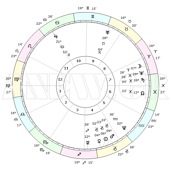 | | ΘΕΣΕΙΣ ΠΛΑΝΗΤΩΝ ΑΣΤΡΟΛΟΓΙΚΟΥ ΧΑΡΤΗ ΤΗΣ ΣΤΙΓΜΗΣ ΑΥΤΗΣ | | | | Πλανήτης | Ζώδιο | Μοίρες | Δεκαήμ. | Σε οίκο | Απόκλιση | | Ακμές των οίκων | | Ηλιος | Αιγόκερως | 06°19' | Πρώτο | 5 | 23 S 17 | | 1ος | 01°44' | Παρθένος | | Σελήνη | Κριός | 06°34' | Πρώτο | 8 | 04 N 36 | | 2ος | 25°46' | Παρθένος | | Ερμής | Τοξότης | 22°20' | Τρίτο | 4 | 23 S 18 | | 3ος | 24°36' | Ζυγός | | Αφροδίτη | Αιγόκερως | 03°57' | Πρώτο | 5 | 23 S 43 | | 4ος | 27°32' | Σκορπιός | | Αρης | Αιγόκερως | 09°30' | Πρώτο | 5 | 23 S 57 | | 5ος | 01°36' | Αιγόκερως | | Δίας | Καρκίνος | 21°53'R | Τρίτο | 11 | 21 N 53 | | 6ος | 03°25' | Υδροχόος | | Κρόνος | Ιχθείς | 26°03' | Τρίτο | 8 | 03 S 39 | | 7ος | 01°44' | Ιχθείς | | Ουρανός | Ταύρος | 28°04'R | Τρίτο | 10 | 19 N 32 | | 8ος | 25°46' | Ιχθείς | | Ποσειδώνας | Ιχθείς | 29°28' | Τρίτο | 8 | 01 S 26 | | 9ος | 24°36' | Κριός | | Πλούτωνας | Υδροχόος | 02°36' | Πρώτο | 5 | 23 S 15 | | 10ος | 27°31' | Ταύρος | | Β. Δεσμός | Ιχθείς | 12°23' | Δεύτερο | 7 | 06 S 55 | | 11ος | 01°36' | Καρκίνος | | Ωροσκόπος | Παρθένος | 01°44' | Πρώτο | | | 12ος | 03°25' | Λέων | | Μεσουράνημα | Ταύρος | 27°31' | Τρίτο | | | |