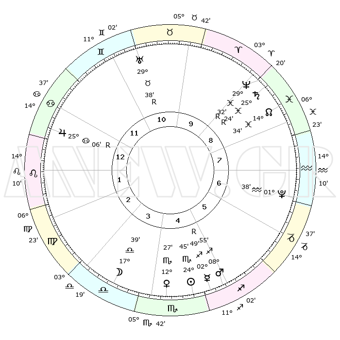 | | ΘΕΣΕΙΣ ΠΛΑΝΗΤΩΝ ΑΣΤΡΟΛΟΓΙΚΟΥ ΧΑΡΤΗ ΤΗΣ ΣΤΙΓΜΗΣ ΑΥΤΗΣ | | | | Πλανήτης | Ζώδιο | Μοίρες | Δεκαήμ. | Σε οίκο | Απόκλιση | | Ακμές των οίκων | | Ηλιος | Σκορπιός | 24°40' | Τρίτο | 5 | 18 S 56 | | 1ος | 16°51' | Καρκίνος | | Σελήνη | Ζυγός | 16°33' | Δεύτερο | 4 | 08 S 52 | | 2ος | 07°19' | Λέων | | Ερμής | Τοξότης | 02°55'R | Πρώτο | 5 | 21 S 24 | | 3ος | 00°40' | Παρθένος | | Αφροδίτη | Σκορπιός | 12°20' | Δεύτερο | 5 | 14 S 26 | | 4ος | 29°47' | Παρθένος | | Αρης | Τοξότης | 08°51' | Πρώτο | 5 | 22 S 18 | | 5ος | 05°37' | Σκορπιός | | Δίας | Καρκίνος | 25°06'R | Τρίτο | 1 | 21 N 14 | | 6ος | 13°32' | Τοξότης | | Κρόνος | Ιχθείς | 25°24'R | Τρίτο | 9 | 04 S 03 | | 7ος | 16°51' | Αιγόκερως | | Ουρανός | Ταύρος | 29°38'R | Τρίτο | 11 | 19 N 52 | | 8ος | 07°19' | Υδροχόος | | Ποσειδώνας | Ιχθείς | 29°32'R | Τρίτο | 9 | 01 S 26 | | 9ος | 00°40' | Ιχθείς | | Πλούτωνας | Υδροχόος | 01°38' | Πρώτο | 7 | 23 S 28 | | 10ος | 29°47' | Ιχθείς | | Β. Δεσμός | Ιχθείς | 14°34' | Δεύτερο | 9 | 06 S 05 | | 11ος | 05°37' | Ταύρος | | Ωροσκόπος | Καρκίνος | 16°51' | Δεύτερο | | | 12ος | 13°32' | Δίδυμοι | | Μεσουράνημα | Ιχθείς | 29°47' | Τρίτο | | | |