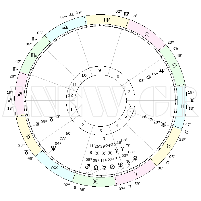 | | ΘΕΣΕΙΣ ΠΛΑΝΗΤΩΝ ΑΣΤΡΟΛΟΓΙΚΟΥ ΧΑΡΤΗ ΤΗΣ ΣΤΙΓΜΗΣ ΑΥΤΗΣ | | | | Πλανήτης | Ζώδιο | Μοίρες | Δεκαήμ. | Σε οίκο | Απόκλιση | | Ακμές των οίκων | | Ηλιος | Ιχθείς | 22°21' | Τρίτο | 4 | 03 S 02 | | 1ος | 03°43' | Τοξότης | | Σελήνη | Αιγόκερως | 09°06' | Πρώτο | 2 | 27 S 40 | | 2ος | 05°23' | Αιγόκερως | | Ερμής | Ιχθείς | 11°41'R | Δεύτερο | 3 | 04 S 31 | | 3ος | 11°43' | Υδροχόος | | Αφροδίτη | Κριός | 08°04' | Πρώτο | 4 | 02 N 11 | | 4ος | 17°48' | Ιχθείς | | Αρης | Ιχθείς | 08°09' | Πρώτο | 3 | 09 S 31 | | 5ος | 18°21' | Κριός | | Δίας | Καρκίνος | 15°05' | Δεύτερο | 8 | 22 N 56 | | 6ος | 12°54' | Ταύρος | | Κρόνος | Κριός | 03°17' | Πρώτο | 4 | 00 S 39 | | 7ος | 03°43' | Δίδυμοι | | Ουρανός | Ταύρος | 28°03' | Τρίτο | 6 | 19 N 33 | | 8ος | 05°23' | Καρκίνος | | Ποσειδώνας | Κριός | 01°29' | Πρώτο | 4 | 00 S 36 | | 9ος | 11°43' | Λέων | | Πλούτωνας | Υδροχόος | 04°50' | Πρώτο | 2 | 22 S 50 | | 10ος | 17°48' | Παρθένος | | Β. Δεσμός | Ιχθείς | 08°25' | Πρώτο | 3 | 08 S 25 | | 11ος | 18°21' | Ζυγός | | Ωροσκόπος | Τοξότης | 03°43' | Πρώτο | | | 12ος | 12°54' | Σκορπιός | | Μεσουράνημα | Παρθένος | 17°48' | Δεύτερο | | | |