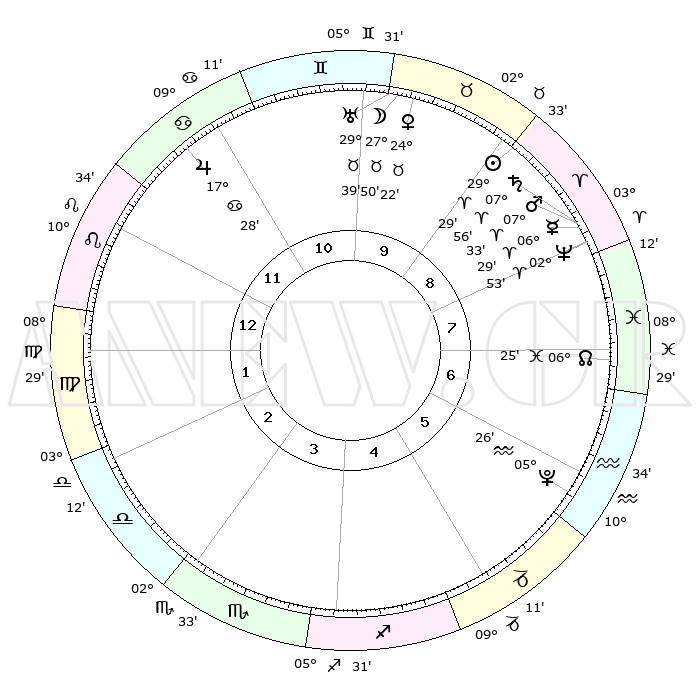 | | ΘΕΣΕΙΣ ΠΛΑΝΗΤΩΝ ΑΣΤΡΟΛΟΓΙΚΟΥ ΧΑΡΤΗ ΤΗΣ ΣΤΙΓΜΗΣ ΑΥΤΗΣ | | | | Πλανήτης | Ζώδιο | Μοίρες | Δεκαήμ. | Σε οίκο | Απόκλιση | | Ακμές των οίκων | | Ηλιος | Κριός | 29°25' | Τρίτο | 9 | 11 N 16 | | 1ος | 18°17' | Λέων | | Σελήνη | Ταύρος | 26°47' | Τρίτο | 10 | 24 N 18 | | 2ος | 10°55' | Παρθένος | | Ερμής | Κριός | 06°22' | Πρώτο | 8 | 00 N 07 | | 3ος | 08°22' | Ζυγός | | Αφροδίτη | Ταύρος | 24°17' | Τρίτο | 10 | 19 N 12 | | 4ος | 10°57' | Σκορπιός | | Αρης | Κριός | 07°30' | Πρώτο | 8 | 02 N 06 | | 5ος | 15°60' | Τοξότης | | Δίας | Καρκίνος | 17°27' | Δεύτερο | 11 | 22 N 40 | | 6ος | 19°05' | Αιγόκερως | | Κρόνος | Κριός | 07°55' | Πρώτο | 8 | 01 N 10 | | 7ος | 18°17' | Υδροχόος | | Ουρανός | Ταύρος | 29°39' | Τρίτο | 10 | 19 N 54 | | 8ος | 10°55' | Ιχθείς | | Ποσειδώνας | Κριός | 02°53' | Πρώτο | 8 | 00 S 04 | | 9ος | 08°22' | Κριός | | Πλούτωνας | Υδροχόος | 05°26' | Πρώτο | 6 | 22 S 48 | | 10ος | 10°57' | Ταύρος | | Β. Δεσμός | Ιχθείς | 06°26' | Πρώτο | 7 | 09 S 09 | | 11ος | 15°60' | Δίδυμοι | | Ωροσκόπος | Λέων | 18°17' | Δεύτερο | | | 12ος | 19°05' | Καρκίνος | | Μεσουράνημα | Ταύρος | 10°57' | Δεύτερο | | | |