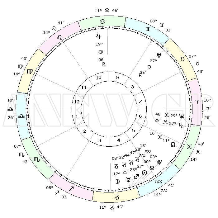 | | ΘΕΣΕΙΣ ΠΛΑΝΗΤΩΝ ΑΣΤΡΟΛΟΓΙΚΟΥ ΧΑΡΤΗ ΤΗΣ ΣΤΙΓΜΗΣ ΑΥΤΗΣ | | | | Πλανήτης | Ζώδιο | Μοίρες | Δεκαήμ. | Σε οίκο | Απόκλιση | | Ακμές των οίκων | | Ηλιος | Αιγόκερως | 27°43' | Τρίτο | 5 | 20 S 37 | | 1ος | 20°47' | Παρθένος | | Σελήνη | Αιγόκερως | 16°19' | Δεύτερο | 4 | 26 S 32 | | 2ος | 16°38' | Ζυγός | | Ερμής | Αιγόκερως | 25°16' | Τρίτο | 5 | 22 S 59 | | 3ος | 16°41' | Σκορπιός | | Αφροδίτη | Υδροχόος | 00°23' | Πρώτο | 5 | 21 S 06 | | 4ος | 19°37' | Τοξότης | | Αρης | Αιγόκερως | 25°41' | Τρίτο | 5 | 21 S 58 | | 5ος | 22°47' | Αιγόκερως | | Δίας | Καρκίνος | 19°06'R | Δεύτερο | 10 | 22 N 21 | | 6ος | 23°34' | Υδροχόος | | Κρόνος | Ιχθείς | 27°28' | Τρίτο | 7 | 03 S 02 | | 7ος | 20°47' | Ιχθείς | | Ουρανός | Ταύρος | 27°35'R | Τρίτο | 9 | 19 N 26 | | 8ος | 16°38' | Κριός | | Ποσειδώνας | Ιχθείς | 29°48' | Τρίτο | 7 | 01 S 18 | | 9ος | 16°41' | Ταύρος | | Πλούτωνας | Υδροχόος | 03°15' | Πρώτο | 5 | 23 S 07 | | 10ος | 19°37' | Δίδυμοι | | Β. Δεσμός | Ιχθείς | 11°17' | Δεύτερο | 6 | 07 S 20 | | 11ος | 22°47' | Καρκίνος | | Ωροσκόπος | Παρθένος | 20°47' | Τρίτο | | | 12ος | 23°34' | Λέων | | Μεσουράνημα | Δίδυμοι | 19°37' | Δεύτερο | | | |