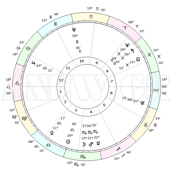 | ΘΕΣΕΙΣ ΠΛΑΝΗΤΩΝ ΑΣΤΡΟΛΟΓΙΚΟΥ ΧΑΡΤΗ ΤΗΣ ΣΤΙΓΜΗΣ ΑΥΤΗΣ | | Πλανήτης | Ζώδιο | Μοίρες | Δεκαήμ. | Σε οίκο | Απόκλιση | | Ακμές των οίκων | Ηλιος | Ζυγός | 29°41' | Τρίτο | 4 | 11 S 21 | | 1ος | 15°44' | Καρκίνος | Σελήνη | Σκορπιός | 14°08' | Δεύτερο | 5 | 20 S 10 | | 2ος | 06°10' | Λέων | Ερμής | Σκορπιός | 22°27' | Τρίτο | 5 | 20 S 46 | | 3ος | 29°24' | Λέων | Αφροδίτη | Ζυγός | 11°09' | Δεύτερο | 4 | 03 S 00 | | 4ος | 28°20' | Παρθένος | Αρης | Σκορπιός | 20°60' | Τρίτο | 5 | 18 S 18 | | 5ος | 04°06' | Σκορπιός | Δίας | Καρκίνος | 24°31' | Τρίτο | 1 | 21 N 17 | | 6ος | 12°12' | Τοξότης | Κρόνος | Ιχθείς | 26°24'R | Τρίτο | 9 | 03 S 43 | | 7ος | 15°44' | Αιγόκερως | Ουρανός | Δίδυμοι | 00°36'R | Πρώτο | 11 | 20 N 04 | | 8ος | 06°10' | Υδροχόος | Ποσειδώνας | Ιχθείς | 29°59'R | Τρίτο | 10 | 01 S 16 | | 9ος | 29°24' | Υδροχόος | Πλούτωνας | Υδροχόος | 01°23' | Πρώτο | 7 | 23 S 32 | | 10ος | 28°20' | Ιχθείς | Β. Δεσμός | Ιχθείς | 15°53' | Δεύτερο | 9 | 05 S 34 | | 11ος | 04°06' | Ταύρος | Ωροσκόπος | Καρκίνος | 15°44' | Δεύτερο | | | 12ος | 12°12' | Δίδυμοι | Μεσουράνημα | Ιχθείς | 28°20' | Τρίτο | | | |