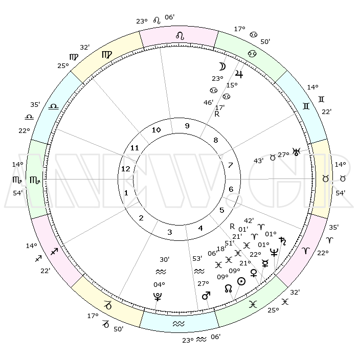 | | ΘΕΣΕΙΣ ΠΛΑΝΗΤΩΝ ΑΣΤΡΟΛΟΓΙΚΟΥ ΧΑΡΤΗ ΤΗΣ ΣΤΙΓΜΗΣ ΑΥΤΗΣ | | | | Πλανήτης | Ζώδιο | Μοίρες | Δεκαήμ. | Σε οίκο | Απόκλιση | | Ακμές των οίκων | | Ηλιος | Ιχθείς | 09°15' | Πρώτο | 5 | 08 S 06 | | 1ος | 27°22' | Ζυγός | | Σελήνη | Καρκίνος | 22°55' | Τρίτο | 9 | 25 N 14 | | 2ος | 25°37' | Σκορπιός | | Ερμής | Ιχθείς | 22°22'R | Τρίτο | 5 | 00 S 11 | | 3ος | 27°23' | Τοξότης | | Αφροδίτη | Ιχθείς | 21°47' | Τρίτο | 5 | 04 S 31 | | 4ος | 01°24' | Υδροχόος | | Αρης | Υδροχόος | 27°50' | Τρίτο | 4 | 13 S 15 | | 5ος | 04°20' | Ιχθείς | | Δίας | Καρκίνος | 15°18'R | Δεύτερο | 9 | 22 N 54 | | 6ος | 03°14' | Κριός | | Κρόνος | Κριός | 01°42' | Πρώτο | 5 | 01 S 17 | | 7ος | 27°22' | Κριός | | Ουρανός | Ταύρος | 27°42' | Τρίτο | 8 | 19 N 28 | | 8ος | 25°37' | Ταύρος | | Ποσειδώνας | Κριός | 01°00' | Πρώτο | 5 | 00 S 48 | | 9ος | 27°23' | Δίδυμοι | | Πλούτωνας | Υδροχόος | 04°30' | Πρώτο | 4 | 22 S 53 | | 10ος | 01°24' | Λέων | | Β. Δεσμός | Ιχθείς | 09°06' | Πρώτο | 5 | 08 S 09 | | 11ος | 04°20' | Παρθένος | | Ωροσκόπος | Ζυγός | 27°22' | Τρίτο | | | 12ος | 03°14' | Ζυγός | | Μεσουράνημα | Λέων | 01°24' | Πρώτο | | | |