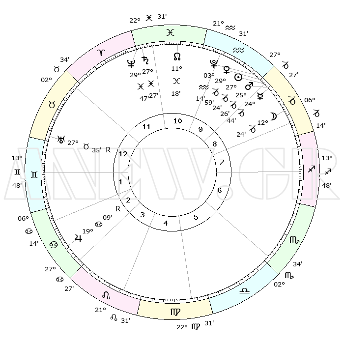 | | ΘΕΣΕΙΣ ΠΛΑΝΗΤΩΝ ΑΣΤΡΟΛΟΓΙΚΟΥ ΧΑΡΤΗ ΤΗΣ ΣΤΙΓΜΗΣ ΑΥΤΗΣ | | | | Πλανήτης | Ζώδιο | Μοίρες | Δεκαήμ. | Σε οίκο | Απόκλιση | | Ακμές των οίκων | | Ηλιος | Αιγόκερως | 27°19' | Τρίτο | 10 | 20 S 41 | | 1ος | 11°21' | Ταύρος | | Σελήνη | Αιγόκερως | 11°29' | Δεύτερο | 9 | 27 S 17 | | 2ος | 10°31' | Δίδυμοι | | Ερμής | Αιγόκερως | 24°37' | Τρίτο | 9 | 23 S 04 | | 3ος | 03°02' | Καρκίνος | | Αφροδίτη | Αιγόκερως | 29°53' | Τρίτο | 10 | 21 S 12 | | 4ος | 24°53' | Καρκίνος | | Αρης | Αιγόκερως | 25°23' | Τρίτο | 10 | 22 S 01 | | 5ος | 20°33' | Λέων | | Δίας | Καρκίνος | 19°09'R | Δεύτερο | 3 | 22 N 20 | | 6ος | 25°33' | Παρθένος | | Κρόνος | Ιχθείς | 27°26' | Τρίτο | 12 | 03 S 03 | | 7ος | 11°21' | Σκορπιός | | Ουρανός | Ταύρος | 27°35'R | Τρίτο | 1 | 19 N 26 | | 8ος | 10°31' | Τοξότης | | Ποσειδώνας | Ιχθείς | 29°47' | Τρίτο | 12 | 01 S 18 | | 9ος | 03°02' | Αιγόκερως | | Πλούτωνας | Υδροχόος | 03°14' | Πρώτο | 10 | 23 S 07 | | 10ος | 24°53' | Αιγόκερως | | Β. Δεσμός | Ιχθείς | 11°18' | Δεύτερο | 11 | 07 S 20 | | 11ος | 20°33' | Υδροχόος | | Ωροσκόπος | Ταύρος | 11°21' | Δεύτερο | | | 12ος | 25°33' | Ιχθείς | | Μεσουράνημα | Αιγόκερως | 24°53' | Τρίτο | | | |