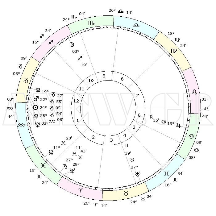 | | ΘΕΣΕΙΣ ΠΛΑΝΗΤΩΝ ΑΣΤΡΟΛΟΓΙΚΟΥ ΧΑΡΤΗ ΤΗΣ ΣΤΙΓΜΗΣ ΑΥΤΗΣ | | | | Πλανήτης | Ζώδιο | Μοίρες | Δεκαήμ. | Σε οίκο | Απόκλιση | | Ακμές των οίκων | | Ηλιος | Αιγόκερως | 24°01' | Τρίτο | 1 | 21 S 18 | | 1ος | 05°02' | Αιγόκερως | | Σελήνη | Τοξότης | 02°26' | Πρώτο | 11 | 25 S 37 | | 2ος | 13°28' | Υδροχόος | | Ερμής | Αιγόκερως | 19°20' | Δεύτερο | 1 | 23 S 45 | | 3ος | 23°43' | Ιχθείς | | Αφροδίτη | Αιγόκερως | 25°48' | Τρίτο | 1 | 21 S 55 | | 4ος | 26°48' | Κριός | | Αρης | Αιγόκερως | 22°52' | Τρίτο | 1 | 22 S 27 | | 5ος | 22°21' | Ταύρος | | Δίας | Καρκίνος | 19°35'R | Δεύτερο | 7 | 22 N 16 | | 6ος | 13°52' | Δίδυμοι | | Κρόνος | Ιχθείς | 27°11' | Τρίτο | 3 | 03 S 09 | | 7ος | 05°02' | Καρκίνος | | Ουρανός | Ταύρος | 27°39'R | Τρίτο | 5 | 19 N 26 | | 8ος | 13°28' | Λέων | | Ποσειδώνας | Ιχθείς | 29°43' | Τρίτο | 3 | 01 S 20 | | 9ος | 23°43' | Παρθένος | | Πλούτωνας | Υδροχόος | 03°08' | Πρώτο | 1 | 23 S 08 | | 10ος | 26°48' | Ζυγός | | Β. Δεσμός | Ιχθείς | 11°28' | Δεύτερο | 2 | 07 S 16 | | 11ος | 22°21' | Σκορπιός | | Ωροσκόπος | Αιγόκερως | 05°02' | Πρώτο | | | 12ος | 13°52' | Τοξότης | | Μεσουράνημα | Ζυγός | 26°48' | Τρίτο | | | |