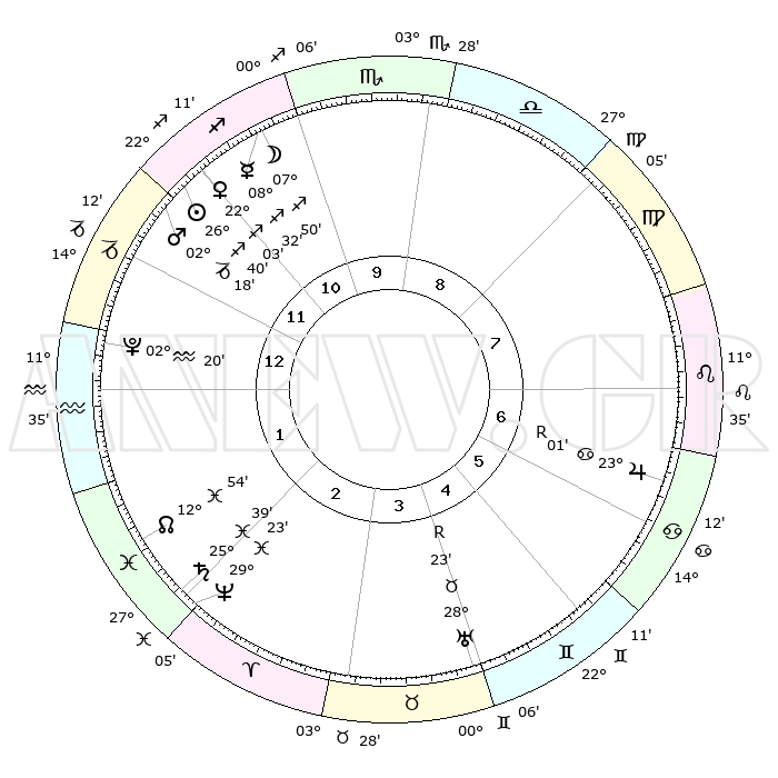 | | ΘΕΣΕΙΣ ΠΛΑΝΗΤΩΝ ΑΣΤΡΟΛΟΓΙΚΟΥ ΧΑΡΤΗ ΤΗΣ ΣΤΙΓΜΗΣ ΑΥΤΗΣ | | | | Πλανήτης | Ζώδιο | Μοίρες | Δεκαήμ. | Σε οίκο | Απόκλιση | | Ακμές των οίκων | | Ηλιος | Τοξότης | 26°21' | Τρίτο | 3 | 23 S 23 | | 1ος | 26°20' | Ζυγός | | Σελήνη | Τοξότης | 04°02' | Πρώτο | 2 | 25 S 48 | | 2ος | 24°32' | Σκορπιός | | Ερμής | Τοξότης | 08°05' | Πρώτο | 2 | 20 S 31 | | 3ος | 26°13' | Τοξότης | | Αφροδίτη | Τοξότης | 21°38' | Τρίτο | 2 | 23 S 08 | | 4ος | 00°10' | Υδροχόος | | Αρης | Αιγόκερως | 02°04' | Πρώτο | 3 | 24 S 13 | | 5ος | 03°07' | Ιχθείς | | Δίας | Καρκίνος | 23°03'R | Τρίτο | 9 | 21 N 40 | | 6ος | 02°06' | Κριός | | Κρόνος | Ιχθείς | 25°38' | Τρίτο | 5 | 03 S 51 | | 7ος | 26°20' | Κριός | | Ουρανός | Ταύρος | 28°23'R | Τρίτο | 8 | 19 N 36 | | 8ος | 24°32' | Ταύρος | | Ποσειδώνας | Ιχθείς | 29°23' | Τρίτο | 5 | 01 S 28 | | 9ος | 26°13' | Δίδυμοι | | Πλούτωνας | Υδροχόος | 02°19' | Πρώτο | 4 | 23 S 18 | | 10ος | 00°10' | Λέων | | Β. Δεσμός | Ιχθείς | 12°55' | Δεύτερο | 5 | 06 S 43 | | 11ος | 03°07' | Παρθένος | | Ωροσκόπος | Ζυγός | 26°20' | Τρίτο | | | 12ος | 02°06' | Ζυγός | | Μεσουράνημα | Λέων | 00°10' | Πρώτο | | | |