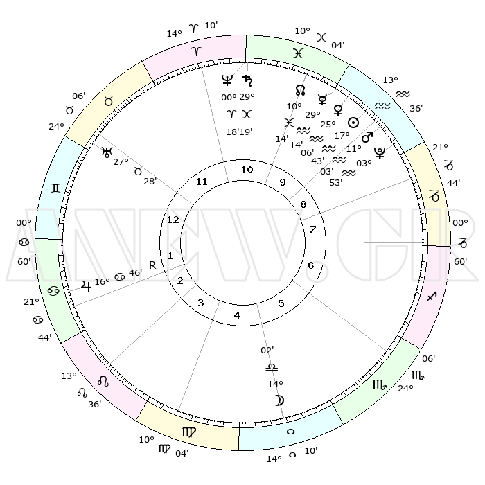 | | ΘΕΣΕΙΣ ΠΛΑΝΗΤΩΝ ΑΣΤΡΟΛΟΓΙΚΟΥ ΧΑΡΤΗ ΤΗΣ ΣΤΙΓΜΗΣ ΑΥΤΗΣ | | | | Πλανήτης | Ζώδιο | Μοίρες | Δεκαήμ. | Σε οίκο | Απόκλιση | | Ακμές των οίκων | | Ηλιος | Υδροχόος | 17°39' | Δεύτερο | 10 | 15 S 32 | | 1ος | 08°38' | Δίδυμοι | | Σελήνη | Ζυγός | 13°15' | Δεύτερο | 5 | 07 S 57 | | 2ος | 01°51' | Καρκίνος | | Ερμής | Υδροχόος | 29°07' | Τρίτο | 10 | 13 S 05 | | 3ος | 23°05' | Καρκίνος | | Αφροδίτη | Υδροχόος | 25°01' | Τρίτο | 10 | 14 S 32 | | 4ος | 16°35' | Λέων | | Αρης | Υδροχόος | 11°00' | Δεύτερο | 9 | 18 S 29 | | 5ος | 16°37' | Παρθένος | | Δίας | Καρκίνος | 16°47'R | Δεύτερο | 2 | 22 N 41 | | 6ος | 26°12' | Ζυγός | | Κρόνος | Ιχθείς | 29°18' | Τρίτο | 11 | 02 S 16 | | 7ος | 08°38' | Τοξότης | | Ουρανός | Ταύρος | 27°28' | Τρίτο | 12 | 19 N 24 | | 8ος | 01°51' | Αιγόκερως | | Ποσειδώνας | Κριός | 00°18' | Πρώτο | 11 | 01 S 05 | | 9ος | 23°05' | Αιγόκερως | | Πλούτωνας | Υδροχόος | 03°52' | Πρώτο | 9 | 22 S 59 | | 10ος | 16°35' | Υδροχόος | | Β. Δεσμός | Ιχθείς | 10°14' | Δεύτερο | 10 | 07 S 44 | | 11ος | 16°37' | Ιχθείς | | Ωροσκόπος | Δίδυμοι | 08°38' | Πρώτο | | | 12ος | 26°12' | Κριός | | Μεσουράνημα | Υδροχόος | 16°35' | Δεύτερο | | | |