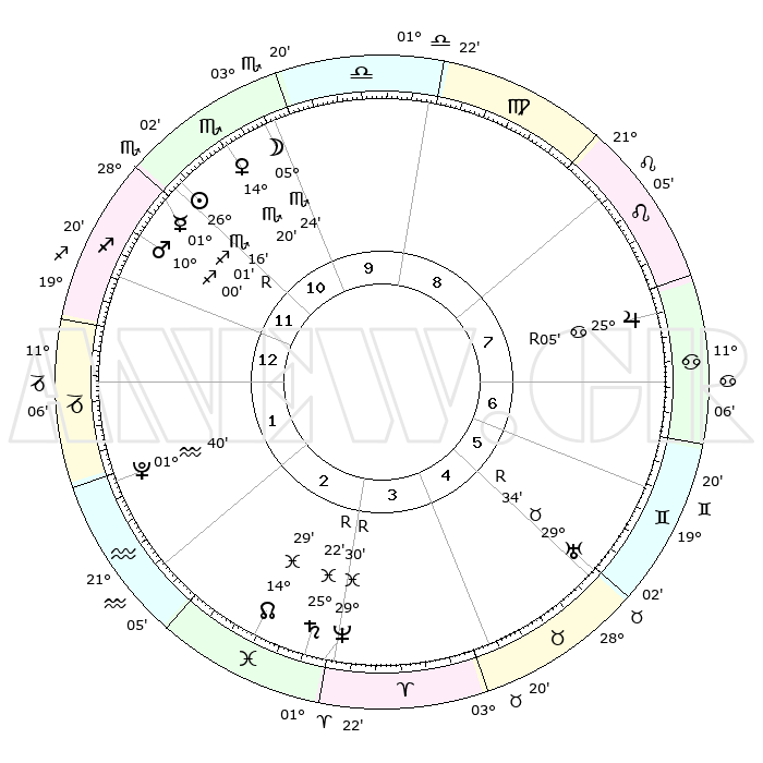| | ΘΕΣΕΙΣ ΠΛΑΝΗΤΩΝ ΑΣΤΡΟΛΟΓΙΚΟΥ ΧΑΡΤΗ ΤΗΣ ΣΤΙΓΜΗΣ ΑΥΤΗΣ | | | | Πλανήτης | Ζώδιο | Μοίρες | Δεκαήμ. | Σε οίκο | Απόκλιση | | Ακμές των οίκων | | Ηλιος | Σκορπιός | 26°12' | Τρίτο | 11 | 19 S 18 | | 1ος | 19°24' | Τοξότης | | Σελήνη | Σκορπιός | 04°38' | Πρώτο | 10 | 16 S 37 | | 2ος | 24°01' | Αιγόκερως | | Ερμής | Τοξότης | 01°06'R | Πρώτο | 12 | 20 S 33 | | 3ος | 02°52' | Ιχθείς | | Αφροδίτη | Σκορπιός | 14°15' | Δεύτερο | 11 | 15 S 02 | | 4ος | 08°13' | Κριός | | Αρης | Τοξότης | 09°57' | Πρώτο | 12 | 22 S 29 | | 5ος | 06°17' | Ταύρος | | Δίας | Καρκίνος | 25°05'R | Τρίτο | 8 | 21 N 14 | | 6ος | 28°58' | Ταύρος | | Κρόνος | Ιχθείς | 25°22'R | Τρίτο | 3 | 04 S 03 | | 7ος | 19°24' | Δίδυμοι | | Ουρανός | Ταύρος | 29°34'R | Τρίτο | 6 | 19 N 51 | | 8ος | 24°01' | Καρκίνος | | Ποσειδώνας | Ιχθείς | 29°30'R | Τρίτο | 3 | 01 S 27 | | 9ος | 02°52' | Παρθένος | | Πλούτωνας | Υδροχόος | 01°40' | Πρώτο | 2 | 23 S 27 | | 10ος | 08°13' | Ζυγός | | Β. Δεσμός | Ιχθείς | 14°29' | Δεύτερο | 3 | 06 S 06 | | 11ος | 06°17' | Σκορπιός | | Ωροσκόπος | Τοξότης | 19°24' | Δεύτερο | | | 12ος | 28°58' | Σκορπιός | | Μεσουράνημα | Ζυγός | 08°13' | Πρώτο | | | |