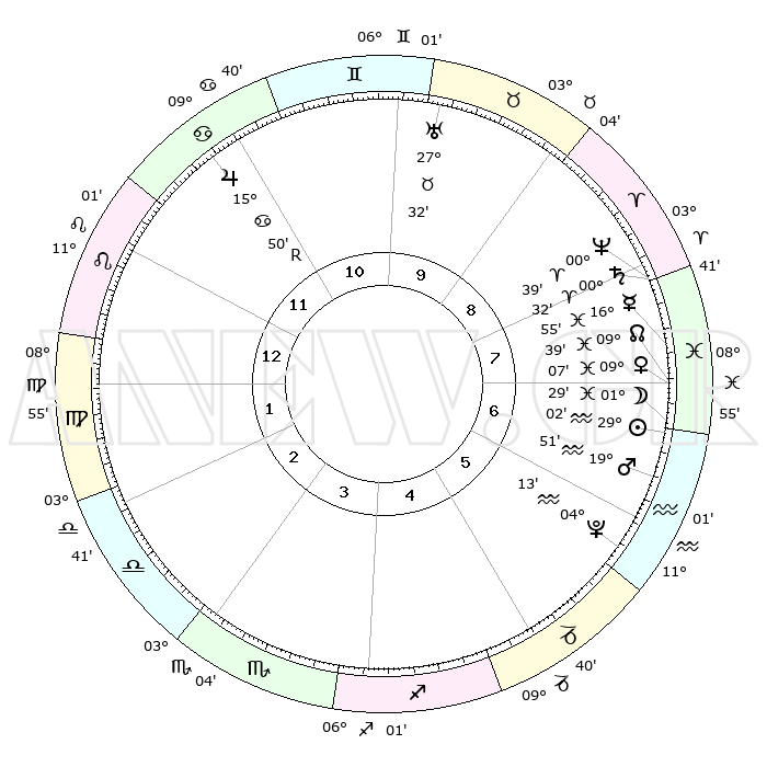 | | ΘΕΣΕΙΣ ΠΛΑΝΗΤΩΝ ΑΣΤΡΟΛΟΓΙΚΟΥ ΧΑΡΤΗ ΤΗΣ ΣΤΙΓΜΗΣ ΑΥΤΗΣ | | | | Πλανήτης | Ζώδιο | Μοίρες | Δεκαήμ. | Σε οίκο | Απόκλιση | | Ακμές των οίκων | | Ηλιος | Υδροχόος | 28°59' | Τρίτο | 7 | 11 S 50 | | 1ος | 20°56' | Λέων | | Σελήνη | Ιχθείς | 00°40' | Πρώτο | 7 | 11 S 57 | | 2ος | 13°50' | Παρθένος | | Ερμής | Ιχθείς | 16°50' | Δεύτερο | 8 | 04 S 35 | | 3ος | 11°35' | Ζυγός | | Αφροδίτη | Ιχθείς | 09°02' | Πρώτο | 7 | 09 S 32 | | 4ος | 14°17' | Σκορπιός | | Αρης | Υδροχόος | 19°48' | Δεύτερο | 6 | 15 S 54 | | 5ος | 19°08' | Τοξότης | | Δίας | Καρκίνος | 15°50'R | Δεύτερο | 11 | 22 N 49 | | 6ος | 21°56' | Αιγόκερως | | Κρόνος | Κριός | 00°31' | Πρώτο | 8 | 01 S 46 | | 7ος | 20°56' | Υδροχόος | | Ουρανός | Ταύρος | 27°32' | Τρίτο | 10 | 19 N 26 | | 8ος | 13°50' | Ιχθείς | | Ποσειδώνας | Κριός | 00°39' | Πρώτο | 8 | 00 S 56 | | 9ος | 11°35' | Κριός | | Πλούτωνας | Υδροχόος | 04°13' | Πρώτο | 6 | 22 S 56 | | 10ος | 14°17' | Ταύρος | | Β. Δεσμός | Ιχθείς | 09°39' | Πρώτο | 7 | 07 S 57 | | 11ος | 19°08' | Δίδυμοι | | Ωροσκόπος | Λέων | 20°56' | Τρίτο | | | 12ος | 21°55' | Καρκίνος | | Μεσουράνημα | Ταύρος | 14°17' | Δεύτερο | | | |