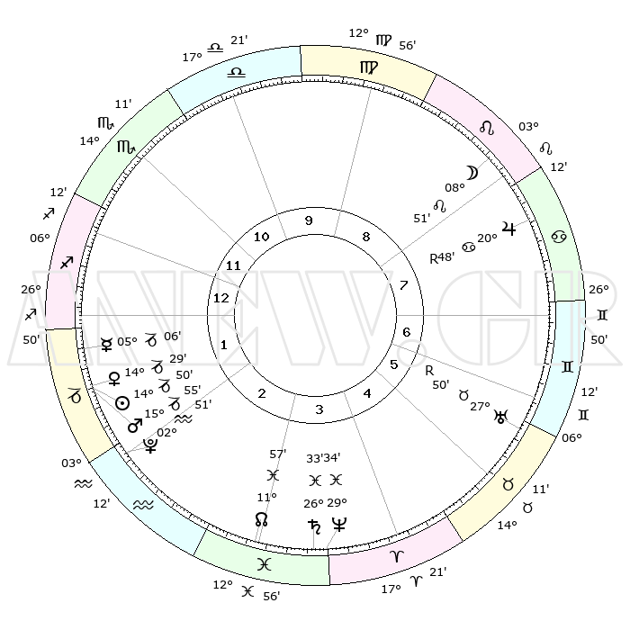 | | ΘΕΣΕΙΣ ΠΛΑΝΗΤΩΝ ΑΣΤΡΟΛΟΓΙΚΟΥ ΧΑΡΤΗ ΤΗΣ ΣΤΙΓΜΗΣ ΑΥΤΗΣ | | | | Πλανήτης | Ζώδιο | Μοίρες | Δεκαήμ. | Σε οίκο | Απόκλιση | | Ακμές των οίκων | | Ηλιος | Αιγόκερως | 13°51' | Δεύτερο | 1 | 22 S 43 | | 1ος | 06°38' | Αιγόκερως | | Σελήνη | Καρκίνος | 24°51' | Τρίτο | 7 | 24 N 44 | | 2ος | 15°28' | Υδροχόος | | Ερμής | Αιγόκερως | 03°36' | Πρώτο | 12 | 24 S 18 | | 3ος | 25°46' | Ιχθείς | | Αφροδίτη | Αιγόκερως | 13°16' | Δεύτερο | 1 | 23 S 24 | | 4ος | 28°34' | Κριός | | Αρης | Αιγόκερως | 15°10' | Δεύτερο | 1 | 23 S 29 | | 5ος | 23°53' | Ταύρος | | Δίας | Καρκίνος | 20°56'R | Τρίτο | 7 | 22 N 03 | | 6ος | 15°20' | Δίδυμοι | | Κρόνος | Ιχθείς | 26°29' | Τρίτο | 3 | 03 S 28 | | 7ος | 06°38' | Καρκίνος | | Ουρανός | Ταύρος | 27°52'R | Τρίτο | 5 | 19 N 29 | | 8ος | 15°28' | Λέων | | Ποσειδώνας | Ιχθείς | 29°33' | Τρίτο | 3 | 01 S 24 | | 9ος | 25°46' | Παρθένος | | Πλούτωνας | Υδροχόος | 02°49' | Πρώτο | 1 | 23 S 12 | | 10ος | 28°34' | Ζυγός | | Β. Δεσμός | Ιχθείς | 11°60' | Δεύτερο | 2 | 07 S 04 | | 11ος | 23°53' | Σκορπιός | | Ωροσκόπος | Αιγόκερως | 06°38' | Πρώτο | | | 12ος | 15°20' | Τοξότης | | Μεσουράνημα | Ζυγός | 28°34' | Τρίτο | | | |