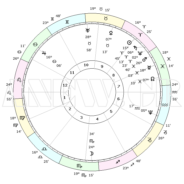 | | ΘΕΣΕΙΣ ΠΛΑΝΗΤΩΝ ΑΣΤΡΟΛΟΓΙΚΟΥ ΧΑΡΤΗ ΤΗΣ ΣΤΙΓΜΗΣ ΑΥΤΗΣ | | | | Πλανήτης | Ζώδιο | Μοίρες | Δεκαήμ. | Σε οίκο | Απόκλιση | | Ακμές των οίκων | | Ηλιος | Κριός | 15°29' | Δεύτερο | 12 | 06 N 05 | | 1ος | 25°55' | Ταύρος | | Σελήνη | Σκορπιός | 21°16' | Τρίτο | 6 | 22 S 50 | | 2ος | 21°35' | Δίδυμοι | | Ερμής | Ιχθείς | 17°45' | Δεύτερο | 11 | 06 S 35 | | 3ος | 13°10' | Καρκίνος | | Αφροδίτη | Ταύρος | 06°53' | Πρώτο | 12 | 13 N 34 | | 4ος | 05°39' | Λέων | | Αρης | Ιχθείς | 26°27' | Τρίτο | 11 | 02 S 21 | | 5ος | 03°26' | Παρθένος | | Δίας | Καρκίνος | 16°05' | Δεύτερο | 3 | 22 N 50 | | 6ος | 11°12' | Ζυγός | | Κρόνος | Κριός | 06°11' | Πρώτο | 11 | 00 N 30 | | 7ος | 25°55' | Σκορπιός | | Ουρανός | Ταύρος | 28°57' | Τρίτο | 1 | 19 N 45 | | 8ος | 21°35' | Τοξότης | | Ποσειδώνας | Κριός | 02°22' | Πρώτο | 11 | 00 S 16 | | 9ος | 13°10' | Αιγόκερως | | Πλούτωνας | Υδροχόος | 05°17' | Πρώτο | 9 | 22 S 47 | | 10ος | 05°39' | Υδροχόος | | Β. Δεσμός | Ιχθείς | 07°11' | Πρώτο | 11 | 08 S 52 | | 11ος | 03°26' | Ιχθείς | | Ωροσκόπος | Ταύρος | 25°55' | Τρίτο | | | 12ος | 11°12' | Κριός | | Μεσουράνημα | Υδροχόος | 05°39' | Πρώτο | | | |