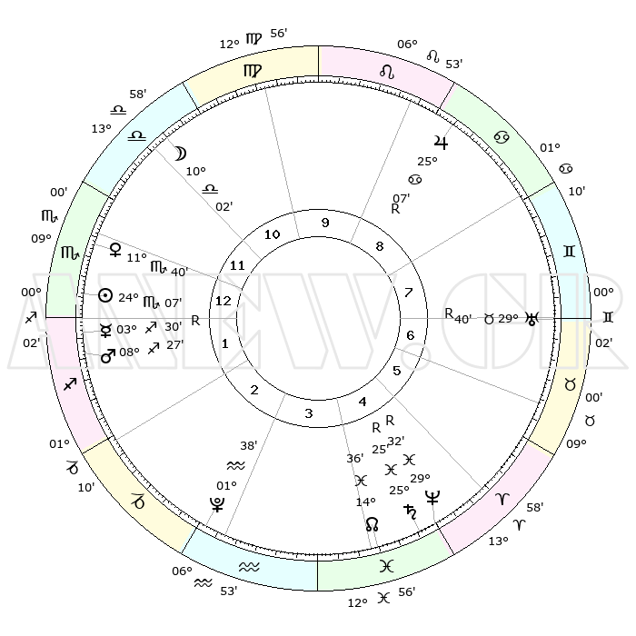 | | ΘΕΣΕΙΣ ΠΛΑΝΗΤΩΝ ΑΣΤΡΟΛΟΓΙΚΟΥ ΧΑΡΤΗ ΤΗΣ ΣΤΙΓΜΗΣ ΑΥΤΗΣ | | | | Πλανήτης | Ζώδιο | Μοίρες | Δεκαήμ. | Σε οίκο | Απόκλιση | | Ακμές των οίκων | | Ηλιος | Σκορπιός | 24°03' | Τρίτο | 1 | 18 S 47 | | 1ος | 09°41' | Σκορπιός | | Σελήνη | Ζυγός | 09°12' | Πρώτο | 11 | 05 S 28 | | 2ος | 08°45' | Τοξότης | | Ερμής | Τοξότης | 03°35'R | Πρώτο | 1 | 21 S 43 | | 3ος | 11°36' | Αιγόκερως | | Αφροδίτη | Σκορπιός | 11°34' | Δεύτερο | 1 | 14 S 11 | | 4ος | 16°29' | Υδροχόος | | Αρης | Τοξότης | 08°24' | Πρώτο | 1 | 22 S 14 | | 5ος | 19°10' | Ιχθείς | | Δίας | Καρκίνος | 25°07'R | Τρίτο | 9 | 21 N 13 | | 6ος | 16°51' | Κριός | | Κρόνος | Ιχθείς | 25°25'R | Τρίτο | 5 | 04 S 03 | | 7ος | 09°41' | Ταύρος | | Ουρανός | Ταύρος | 29°40'R | Τρίτο | 7 | 19 N 52 | | 8ος | 08°45' | Δίδυμοι | | Ποσειδώνας | Ιχθείς | 29°32'R | Τρίτο | 5 | 01 S 26 | | 9ος | 11°36' | Καρκίνος | | Πλούτωνας | Υδροχόος | 01°38' | Πρώτο | 3 | 23 S 28 | | 10ος | 16°29' | Λέων | | Β. Δεσμός | Ιχθείς | 14°36' | Δεύτερο | 4 | 06 S 04 | | 11ος | 19°10' | Παρθένος | | Ωροσκόπος | Σκορπιός | 09°41' | Πρώτο | | | 12ος | 16°51' | Ζυγός | | Μεσουράνημα | Λέων | 16°29' | Δεύτερο | | | |