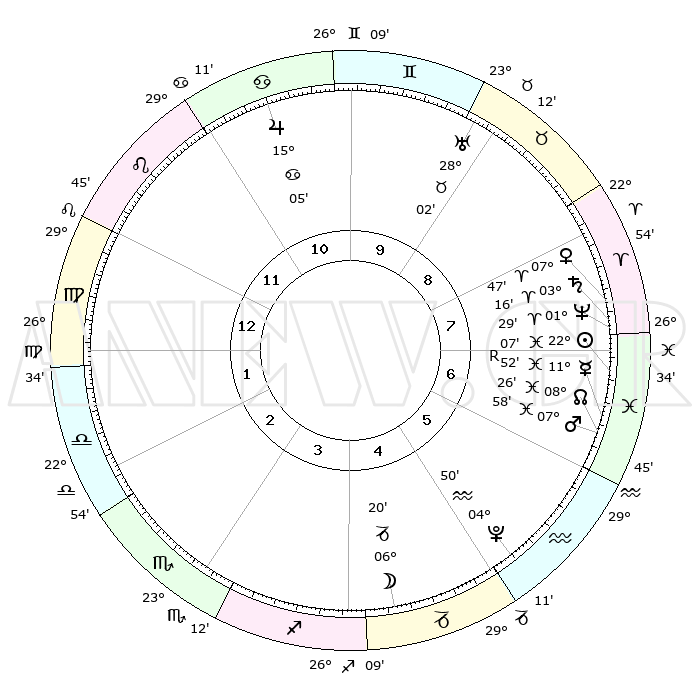 | | ΘΕΣΕΙΣ ΠΛΑΝΗΤΩΝ ΑΣΤΡΟΛΟΓΙΚΟΥ ΧΑΡΤΗ ΤΗΣ ΣΤΙΓΜΗΣ ΑΥΤΗΣ | | | | Πλανήτης | Ζώδιο | Μοίρες | Δεκαήμ. | Σε οίκο | Απόκλιση | | Ακμές των οίκων | | Ηλιος | Ιχθείς | 22°04' | Τρίτο | 7 | 03 S 09 | | 1ος | 08°48' | Παρθένος | | Σελήνη | Αιγόκερως | 05°36' | Πρώτο | 4 | 28 S 01 | | 2ος | 03°34' | Ζυγός | | Ερμής | Ιχθείς | 11°55'R | Δεύτερο | 7 | 04 S 23 | | 3ος | 02°56' | Σκορπιός | | Αφροδίτη | Κριός | 07°42' | Πρώτο | 8 | 02 N 02 | | 4ος | 05°53' | Τοξότης | | Αρης | Ιχθείς | 07°55' | Πρώτο | 6 | 09 S 36 | | 5ος | 09°33' | Αιγόκερως | | Δίας | Καρκίνος | 15°05' | Δεύτερο | 11 | 22 N 56 | | 6ος | 10°54' | Υδροχόος | | Κρόνος | Κριός | 03°15' | Πρώτο | 7 | 00 S 39 | | 7ος | 08°48' | Ιχθείς | | Ουρανός | Ταύρος | 28°02' | Τρίτο | 9 | 19 N 33 | | 8ος | 03°34' | Κριός | | Ποσειδώνας | Κριός | 01°29' | Πρώτο | 7 | 00 S 37 | | 9ος | 02°56' | Ταύρος | | Πλούτωνας | Υδροχόος | 04°50' | Πρώτο | 5 | 22 S 50 | | 10ος | 05°53' | Δίδυμοι | | Β. Δεσμός | Ιχθείς | 08°26' | Πρώτο | 6 | 08 S 24 | | 11ος | 09°33' | Καρκίνος | | Ωροσκόπος | Παρθένος | 08°48' | Πρώτο | | | 12ος | 10°54' | Λέων | | Μεσουράνημα | Δίδυμοι | 05°53' | Πρώτο | | | |
