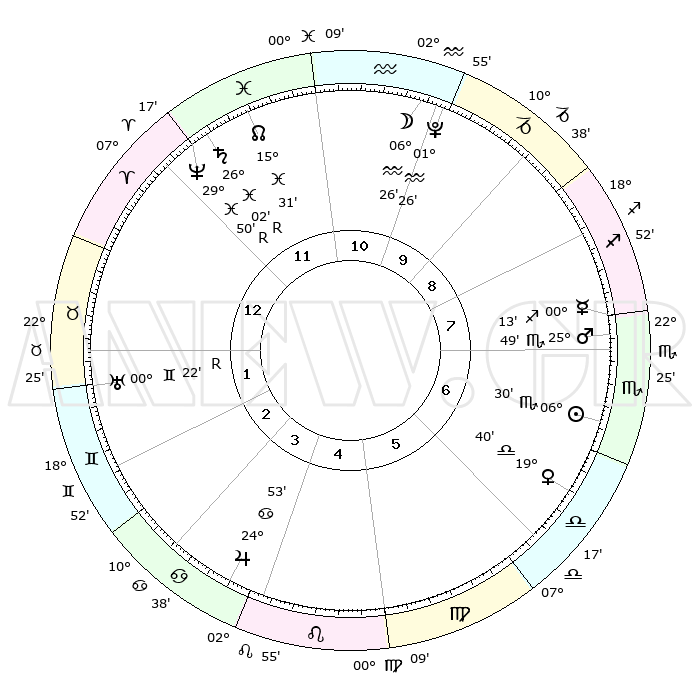 | | ΘΕΣΕΙΣ ΠΛΑΝΗΤΩΝ ΑΣΤΡΟΛΟΓΙΚΟΥ ΧΑΡΤΗ ΤΗΣ ΣΤΙΓΜΗΣ ΑΥΤΗΣ | | | | Πλανήτης | Ζώδιο | Μοίρες | Δεκαήμ. | Σε οίκο | Απόκλιση | | Ακμές των οίκων | | Ηλιος | Σκορπιός | 06°24' | Πρώτο | 7 | 13 S 39 | | 1ος | 29°46' | Ιχθείς | | Σελήνη | Υδροχόος | 05°12' | Πρώτο | 11 | 22 S 17 | | 2ος | 10°07' | Ταύρος | | Ερμής | Τοξότης | 00°08' | Πρώτο | 8 | 22 S 58 | | 3ος | 07°33' | Δίδυμοι | | Αφροδίτη | Ζυγός | 19°33' | Δεύτερο | 7 | 06 S 16 | | 4ος | 29°52' | Δίδυμοι | | Αρης | Σκορπιός | 25°45' | Τρίτο | 8 | 19 S 33 | | 5ος | 22°10' | Καρκίνος | | Δίας | Καρκίνος | 24°52' | Τρίτο | 5 | 21 N 14 | | 6ος | 19°32' | Λέων | | Κρόνος | Ιχθείς | 26°02'R | Τρίτο | 12 | 03 S 51 | | 7ος | 29°46' | Παρθένος | | Ουρανός | Δίδυμοι | 00°22'R | Πρώτο | 2 | 20 N 01 | | 8ος | 10°07' | Σκορπιός | | Ποσειδώνας | Ιχθείς | 29°50'R | Τρίτο | 1 | 01 S 19 | | 9ος | 07°33' | Τοξότης | | Πλούτωνας | Υδροχόος | 01°25' | Πρώτο | 11 | 23 S 31 | | 10ος | 29°52' | Τοξότης | | Β. Δεσμός | Ιχθείς | 15°32' | Δεύτερο | 12 | 05 S 42 | | 11ος | 22°10' | Αιγόκερως | | Ωροσκόπος | Ιχθείς | 29°46' | Τρίτο | | | 12ος | 19°32' | Υδροχόος | | Μεσουράνημα | Τοξότης | 29°52' | Τρίτο | | | |
