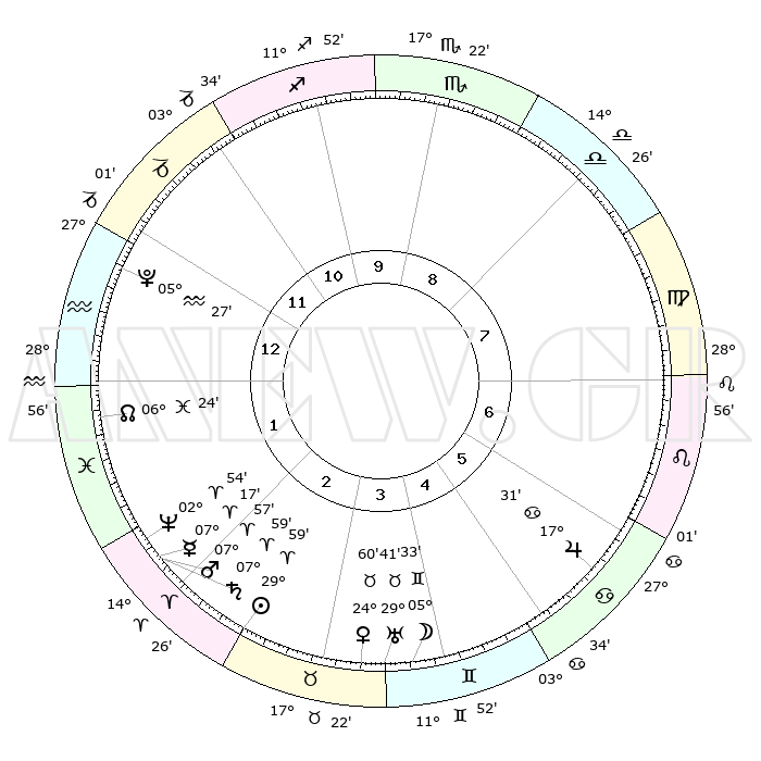 | | ΘΕΣΕΙΣ ΠΛΑΝΗΤΩΝ ΑΣΤΡΟΛΟΓΙΚΟΥ ΧΑΡΤΗ ΤΗΣ ΣΤΙΓΜΗΣ ΑΥΤΗΣ | | | | Πλανήτης | Ζώδιο | Μοίρες | Δεκαήμ. | Σε οίκο | Απόκλιση | | Ακμές των οίκων | | Ηλιος | Κριός | 29°56' | Τρίτο | 3 | 11 N 27 | | 1ος | 02°39' | Υδροχόος | | Σελήνη | Δίδυμοι | 04°44' | Πρώτο | 4 | 26 N 05 | | 2ος | 17°10' | Ιχθείς | | Ερμής | Κριός | 07°12' | Πρώτο | 2 | 00 N 27 | | 3ος | 25°11' | Κριός | | Αφροδίτη | Ταύρος | 24°56' | Τρίτο | 4 | 19 N 23 | | 4ος | 23°12' | Ταύρος | | Αρης | Κριός | 07°55' | Πρώτο | 2 | 02 N 16 | | 5ος | 15°46' | Δίδυμοι | | Δίας | Καρκίνος | 17°31' | Δεύτερο | 6 | 22 N 40 | | 6ος | 07°18' | Καρκίνος | | Κρόνος | Κριός | 07°59' | Πρώτο | 2 | 01 N 11 | | 7ος | 02°39' | Λέων | | Ουρανός | Ταύρος | 29°41' | Τρίτο | 4 | 19 N 55 | | 8ος | 17°10' | Παρθένος | | Ποσειδώνας | Κριός | 02°54' | Πρώτο | 2 | 00 S 03 | | 9ος | 25°11' | Ζυγός | | Πλούτωνας | Υδροχόος | 05°27' | Πρώτο | 1 | 22 S 48 | | 10ος | 23°12' | Σκορπιός | | Β. Δεσμός | Ιχθείς | 06°24' | Πρώτο | 1 | 09 S 10 | | 11ος | 15°46' | Τοξότης | | Ωροσκόπος | Υδροχόος | 02°39' | Πρώτο | | | 12ος | 07°18' | Αιγόκερως | | Μεσουράνημα | Σκορπιός | 23°12' | Τρίτο | | | |