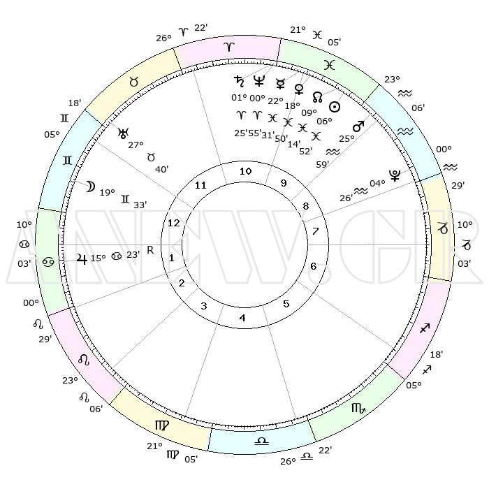 | | ΘΕΣΕΙΣ ΠΛΑΝΗΤΩΝ ΑΣΤΡΟΛΟΓΙΚΟΥ ΧΑΡΤΗ ΤΗΣ ΣΤΙΓΜΗΣ ΑΥΤΗΣ | | | | Πλανήτης | Ζώδιο | Μοίρες | Δεκαήμ. | Σε οίκο | Απόκλιση | | Ακμές των οίκων | | Ηλιος | Ιχθείς | 06°48' | Πρώτο | 10 | 09 S 01 | | 1ος | 18°15' | Δίδυμοι | | Σελήνη | Δίδυμοι | 18°37' | Δεύτερο | 1 | 28 N 08 | | 2ος | 10°06' | Καρκίνος | | Ερμής | Ιχθείς | 22°30' | Τρίτο | 10 | 00 S 35 | | 3ος | 01°23' | Λέων | | Αφροδίτη | Ιχθείς | 18°45' | Δεύτερο | 10 | 05 S 45 | | 4ος | 25°60' | Λέων | | Αρης | Υδροχόος | 25°56' | Τρίτο | 9 | 13 S 54 | | 5ος | 27°51' | Παρθένος | | Δίας | Καρκίνος | 15°24'R | Δεύτερο | 2 | 22 N 53 | | 6ος | 08°06' | Σκορπιός | | Κρόνος | Κριός | 01°25' | Πρώτο | 11 | 01 S 24 | | 7ος | 18°15' | Τοξότης | | Ουρανός | Ταύρος | 27°40' | Τρίτο | 12 | 19 N 27 | | 8ος | 10°06' | Αιγόκερως | | Ποσειδώνας | Κριός | 00°55' | Πρώτο | 11 | 00 S 50 | | 9ος | 01°23' | Υδροχόος | | Πλούτωνας | Υδροχόος | 04°26' | Πρώτο | 9 | 22 S 53 | | 10ος | 25°60' | Υδροχόος | | Β. Δεσμός | Ιχθείς | 09°14' | Πρώτο | 10 | 08 S 06 | | 11ος | 27°51' | Ιχθείς | | Ωροσκόπος | Δίδυμοι | 18°15' | Δεύτερο | | | 12ος | 08°06' | Ταύρος | | Μεσουράνημα | Υδροχόος | 25°60' | Τρίτο | | | |