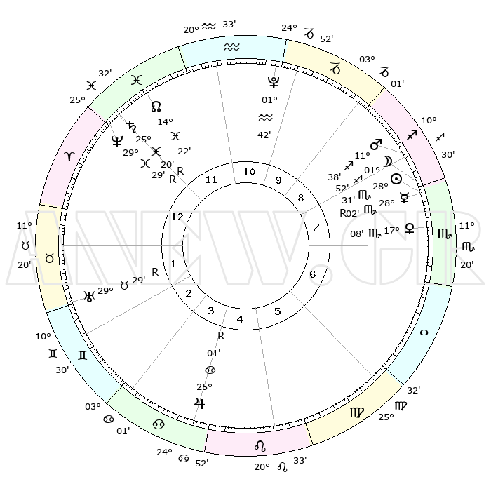 | | ΘΕΣΕΙΣ ΠΛΑΝΗΤΩΝ ΑΣΤΡΟΛΟΓΙΚΟΥ ΧΑΡΤΗ ΤΗΣ ΣΤΙΓΜΗΣ ΑΥΤΗΣ | | | | Πλανήτης | Ζώδιο | Μοίρες | Δεκαήμ. | Σε οίκο | Απόκλιση | | Ακμές των οίκων | | Ηλιος | Σκορπιός | 28°26' | Τρίτο | 8 | 19 S 48 | | 1ος | 01°12' | Κριός | | Σελήνη | Τοξότης | 01°00' | Πρώτο | 8 | 25 S 06 | | 2ος | 11°12' | Ταύρος | | Ερμής | Σκορπιός | 28°08'R | Τρίτο | 8 | 19 S 10 | | 3ος | 08°25' | Δίδυμοι | | Αφροδίτη | Σκορπιός | 17°02' | Δεύτερο | 8 | 15 S 55 | | 4ος | 00°41' | Καρκίνος | | Αρης | Τοξότης | 11°35' | Δεύτερο | 9 | 22 S 44 | | 5ος | 23°02' | Καρκίνος | | Δίας | Καρκίνος | 25°01'R | Τρίτο | 5 | 21 N 15 | | 6ος | 20°37' | Λέων | | Κρόνος | Ιχθείς | 25°20'R | Τρίτο | 12 | 04 S 04 | | 7ος | 01°12' | Ζυγός | | Ουρανός | Ταύρος | 29°29'R | Τρίτο | 2 | 19 N 50 | | 8ος | 11°12' | Σκορπιός | | Ποσειδώνας | Ιχθείς | 29°29'R | Τρίτο | 12 | 01 S 27 | | 9ος | 08°25' | Τοξότης | | Πλούτωνας | Υδροχόος | 01°42' | Πρώτο | 11 | 23 S 27 | | 10ος | 00°41' | Αιγόκερως | | Β. Δεσμός | Ιχθείς | 14°22' | Δεύτερο | 12 | 06 S 09 | | 11ος | 23°02' | Αιγόκερως | | Ωροσκόπος | Κριός | 01°12' | Πρώτο | | | 12ος | 20°37' | Υδροχόος | | Μεσουράνημα | Αιγόκερως | 00°41' | Πρώτο | | | |