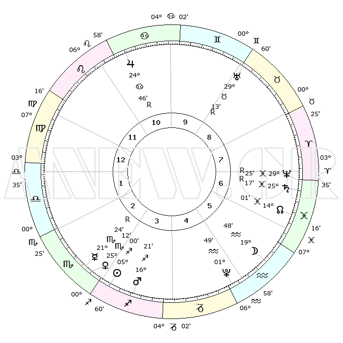 | | ΘΕΣΕΙΣ ΠΛΑΝΗΤΩΝ ΑΣΤΡΟΛΟΓΙΚΟΥ ΧΑΡΤΗ ΤΗΣ ΣΤΙΓΜΗΣ ΑΥΤΗΣ | | | | Πλανήτης | Ζώδιο | Μοίρες | Δεκαήμ. | Σε οίκο | Απόκλιση | | Ακμές των οίκων | | Ηλιος | Τοξότης | 04°58' | Πρώτο | 3 | 21 S 07 | | 1ος | 23°33' | Παρθένος | | Σελήνη | Υδροχόος | 19°22' | Δεύτερο | 5 | 17 S 02 | | 2ος | 19°38' | Ζυγός | | Ερμής | Σκορπιός | 21°25'R | Τρίτο | 3 | 15 S 56 | | 3ος | 19°49' | Σκορπιός | | Αφροδίτη | Σκορπιός | 25°09' | Τρίτο | 3 | 18 S 14 | | 4ος | 22°45' | Τοξότης | | Αρης | Τοξότης | 16°20' | Δεύτερο | 3 | 23 S 21 | | 5ος | 25°50' | Αιγόκερως | | Δίας | Καρκίνος | 24°46'R | Τρίτο | 10 | 21 N 19 | | 6ος | 26°31' | Υδροχόος | | Κρόνος | Ιχθείς | 25°17'R | Τρίτο | 7 | 04 S 04 | | 7ος | 23°33' | Ιχθείς | | Ουρανός | Ταύρος | 29°13'R | Τρίτο | 9 | 19 N 46 | | 8ος | 19°38' | Κριός | | Ποσειδώνας | Ιχθείς | 29°25'R | Τρίτο | 7 | 01 S 28 | | 9ος | 19°49' | Ταύρος | | Πλούτωνας | Υδροχόος | 01°49' | Πρώτο | 5 | 23 S 25 | | 10ος | 22°45' | Δίδυμοι | | Β. Δεσμός | Ιχθείς | 14°01' | Δεύτερο | 6 | 06 S 17 | | 11ος | 25°50' | Καρκίνος | | Ωροσκόπος | Παρθένος | 23°33' | Τρίτο | | | 12ος | 26°31' | Λέων | | Μεσουράνημα | Δίδυμοι | 22°45' | Τρίτο | | | |