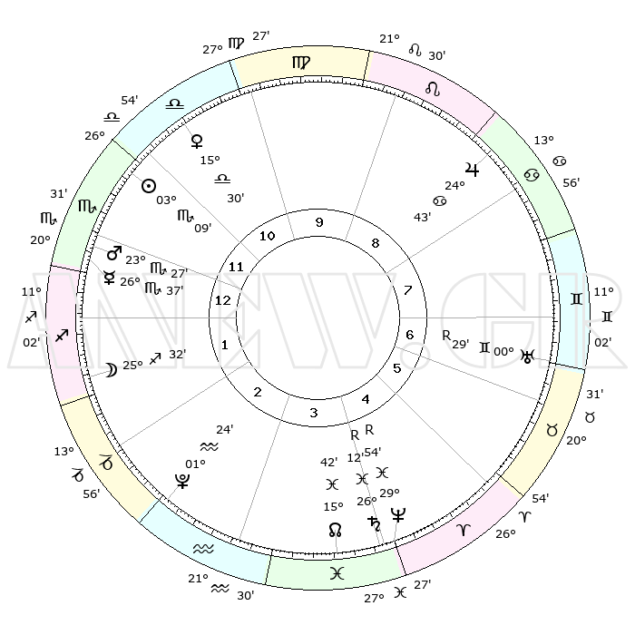 | | ΘΕΣΕΙΣ ΠΛΑΝΗΤΩΝ ΑΣΤΡΟΛΟΓΙΚΟΥ ΧΑΡΤΗ ΤΗΣ ΣΤΙΓΜΗΣ ΑΥΤΗΣ | | | | Πλανήτης | Ζώδιο | Μοίρες | Δεκαήμ. | Σε οίκο | Απόκλιση | | Ακμές των οίκων | | Ηλιος | Σκορπιός | 02°44' | Πρώτο | 4 | 12 S 25 | | 1ος | 05°01' | Λέων | | Σελήνη | Τοξότης | 20°23' | Τρίτο | 5 | 28 S 11 | | 2ος | 26°25' | Λέων | | Ερμής | Σκορπιός | 26°07' | Τρίτο | 4 | 21 S 53 | | 3ος | 22°09' | Παρθένος | | Αφροδίτη | Ζυγός | 14°57' | Δεύτερο | 3 | 04 S 29 | | 4ος | 23°45' | Ζυγός | | Αρης | Σκορπιός | 23°09' | Τρίτο | 4 | 18 S 53 | | 5ος | 29°37' | Σκορπιός | | Δίας | Καρκίνος | 24°42' | Τρίτο | 12 | 21 N 15 | | 6ος | 04°31' | Αιγόκερως | | Κρόνος | Ιχθείς | 26°14'R | Τρίτο | 9 | 03 S 47 | | 7ος | 05°01' | Υδροχόος | | Ουρανός | Δίδυμοι | 00°30'R | Πρώτο | 11 | 20 N 03 | | 8ος | 26°25' | Υδροχόος | | Ποσειδώνας | Ιχθείς | 29°55'R | Τρίτο | 9 | 01 S 17 | | 9ος | 22°09' | Ιχθείς | | Πλούτωνας | Υδροχόος | 01°24' | Πρώτο | 6 | 23 S 32 | | 10ος | 23°45' | Κριός | | Β. Δεσμός | Ιχθείς | 15°43' | Δεύτερο | 8 | 05 S 38 | | 11ος | 29°37' | Ταύρος | | Ωροσκόπος | Λέων | 05°01' | Πρώτο | | | 12ος | 04°31' | Καρκίνος | | Μεσουράνημα | Κριός | 23°45' | Τρίτο | | | |