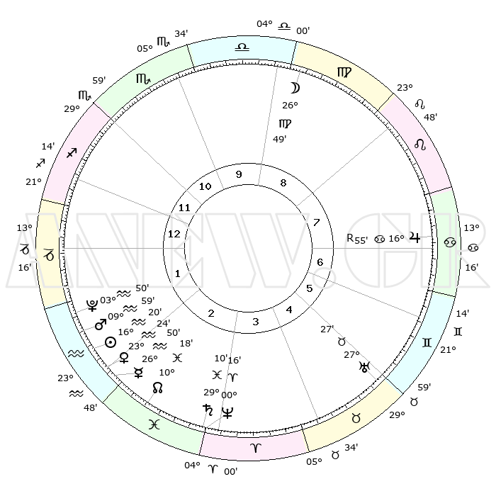 | | ΘΕΣΕΙΣ ΠΛΑΝΗΤΩΝ ΑΣΤΡΟΛΟΓΙΚΟΥ ΧΑΡΤΗ ΤΗΣ ΣΤΙΓΜΗΣ ΑΥΤΗΣ | | | | Πλανήτης | Ζώδιο | Μοίρες | Δεκαήμ. | Σε οίκο | Απόκλιση | | Ακμές των οίκων | | Ηλιος | Υδροχόος | 16°16' | Δεύτερο | 2 | 15 S 57 | | 1ος | 19°58' | Τοξότης | | Σελήνη | Παρθένος | 25°55' | Τρίτο | 9 | 00 N 13 | | 2ος | 24°42' | Αιγόκερως | | Ερμής | Υδροχόος | 26°43' | Τρίτο | 2 | 14 S 04 | | 3ος | 03°39' | Ιχθείς | | Αφροδίτη | Υδροχόος | 23°18' | Τρίτο | 2 | 15 S 05 | | 4ος | 08°56' | Κριός | | Αρης | Υδροχόος | 09°56' | Πρώτο | 2 | 18 S 46 | | 5ος | 06°54' | Ταύρος | | Δίας | Καρκίνος | 16°55'R | Δεύτερο | 7 | 22 N 40 | | 6ος | 29°32' | Ταύρος | | Κρόνος | Ιχθείς | 29°10' | Τρίτο | 3 | 02 S 19 | | 7ος | 19°58' | Δίδυμοι | | Ουρανός | Ταύρος | 27°27' | Τρίτο | 5 | 19 N 24 | | 8ος | 24°42' | Καρκίνος | | Ποσειδώνας | Κριός | 00°16' | Πρώτο | 3 | 01 S 06 | | 9ος | 03°39' | Παρθένος | | Πλούτωνας | Υδροχόος | 03°50' | Πρώτο | 2 | 23 S 00 | | 10ος | 08°56' | Ζυγός | | Β. Δεσμός | Ιχθείς | 10°19' | Δεύτερο | 3 | 07 S 42 | | 11ος | 06°54' | Σκορπιός | | Ωροσκόπος | Τοξότης | 19°58' | Δεύτερο | | | 12ος | 29°32' | Σκορπιός | | Μεσουράνημα | Ζυγός | 08°56' | Πρώτο | | | |