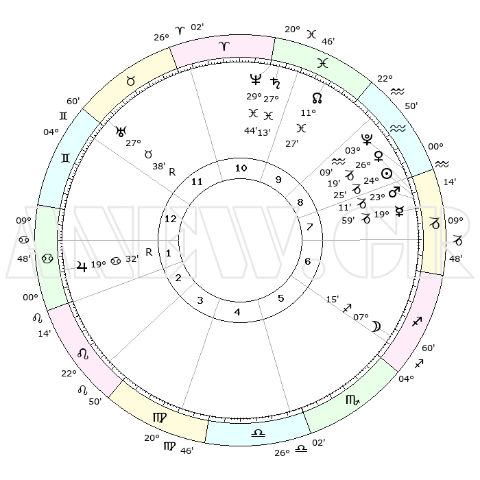 | | ΘΕΣΕΙΣ ΠΛΑΝΗΤΩΝ ΑΣΤΡΟΛΟΓΙΚΟΥ ΧΑΡΤΗ ΤΗΣ ΣΤΙΓΜΗΣ ΑΥΤΗΣ | | | | Πλανήτης | Ζώδιο | Μοίρες | Δεκαήμ. | Σε οίκο | Απόκλιση | | Ακμές των οίκων | | Ηλιος | Αιγόκερως | 24°21' | Τρίτο | 8 | 21 S 14 | | 1ος | 15°25' | Δίδυμοι | | Σελήνη | Τοξότης | 06°24' | Πρώτο | 6 | 26 S 24 | | 2ος | 07°37' | Καρκίνος | | Ερμής | Αιγόκερως | 19°52' | Δεύτερο | 8 | 23 S 42 | | 3ος | 28°51' | Καρκίνος | | Αφροδίτη | Αιγόκερως | 26°14' | Τρίτο | 8 | 21 S 51 | | 4ος | 23°07' | Λέων | | Αρης | Αιγόκερως | 23°07' | Τρίτο | 8 | 22 S 24 | | 5ος | 24°25' | Παρθένος | | Δίας | Καρκίνος | 19°33'R | Δεύτερο | 2 | 22 N 17 | | 6ος | 04°34' | Σκορπιός | | Κρόνος | Ιχθείς | 27°12' | Τρίτο | 11 | 03 S 09 | | 7ος | 15°25' | Τοξότης | | Ουρανός | Ταύρος | 27°38'R | Τρίτο | 12 | 19 N 26 | | 8ος | 07°37' | Αιγόκερως | | Ποσειδώνας | Ιχθείς | 29°44' | Τρίτο | 11 | 01 S 19 | | 9ος | 28°51' | Αιγόκερως | | Πλούτωνας | Υδροχόος | 03°09' | Πρώτο | 9 | 23 S 08 | | 10ος | 23°07' | Υδροχόος | | Β. Δεσμός | Ιχθείς | 11°27' | Δεύτερο | 10 | 07 S 16 | | 11ος | 24°25' | Ιχθείς | | Ωροσκόπος | Δίδυμοι | 15°25' | Δεύτερο | | | 12ος | 04°34' | Ταύρος | | Μεσουράνημα | Υδροχόος | 23°07' | Τρίτο | | | |