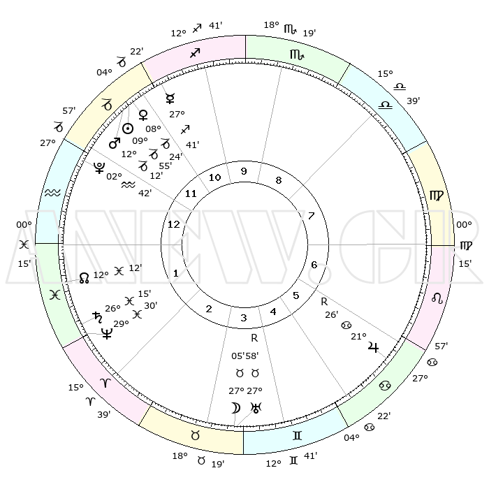 | | ΘΕΣΕΙΣ ΠΛΑΝΗΤΩΝ ΑΣΤΡΟΛΟΓΙΚΟΥ ΧΑΡΤΗ ΤΗΣ ΣΤΙΓΜΗΣ ΑΥΤΗΣ | | | | Πλανήτης | Ζώδιο | Μοίρες | Δεκαήμ. | Σε οίκο | Απόκλιση | | Ακμές των οίκων | | Ηλιος | Αιγόκερως | 09°50' | Πρώτο | 12 | 23 S 04 | | 1ος | 25°12' | Αιγόκερως | | Σελήνη | Ταύρος | 25°59' | Τρίτο | 4 | 24 N 00 | | 2ος | 08°25' | Ιχθείς | | Ερμής | Τοξότης | 27°34' | Τρίτο | 11 | 23 S 54 | | 3ος | 17°34' | Κριός | | Αφροδίτη | Αιγόκερως | 08°19' | Πρώτο | 12 | 23 S 39 | | 4ος | 16°53' | Ταύρος | | Αρης | Αιγόκερως | 12°09' | Δεύτερο | 12 | 23 S 46 | | 5ος | 10°02' | Δίδυμοι | | Δίας | Καρκίνος | 21°27'R | Τρίτο | 6 | 21 N 57 | | 6ος | 01°18' | Καρκίνος | | Κρόνος | Ιχθείς | 26°15' | Τρίτο | 2 | 03 S 34 | | 7ος | 25°12' | Καρκίνος | | Ουρανός | Ταύρος | 27°58'R | Τρίτο | 4 | 19 N 30 | | 8ος | 08°25' | Παρθένος | | Ποσειδώνας | Ιχθείς | 29°30' | Τρίτο | 2 | 01 S 25 | | 9ος | 17°34' | Ζυγός | | Πλούτωνας | Υδροχόος | 02°42' | Πρώτο | 1 | 23 S 13 | | 10ος | 16°53' | Σκορπιός | | Β. Δεσμός | Ιχθείς | 12°12' | Δεύτερο | 2 | 06 S 59 | | 11ος | 10°02' | Τοξότης | | Ωροσκόπος | Αιγόκερως | 25°12' | Τρίτο | | | 12ος | 01°18' | Αιγόκερως | | Μεσουράνημα | Σκορπιός | 16°53' | Δεύτερο | | | |