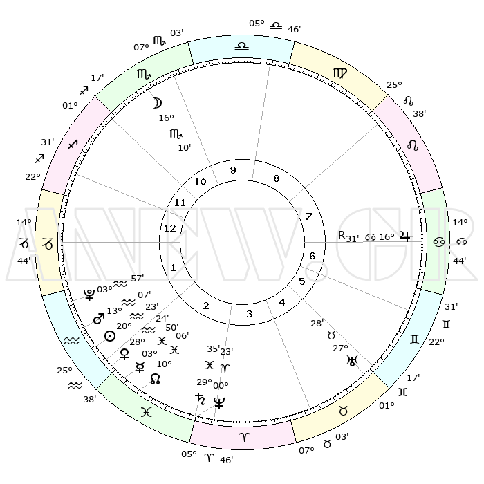 | | ΘΕΣΕΙΣ ΠΛΑΝΗΤΩΝ ΑΣΤΡΟΛΟΓΙΚΟΥ ΧΑΡΤΗ ΤΗΣ ΣΤΙΓΜΗΣ ΑΥΤΗΣ | | | | Πλανήτης | Ζώδιο | Μοίρες | Δεκαήμ. | Σε οίκο | Απόκλιση | | Ακμές των οίκων | | Ηλιος | Υδροχόος | 20°19' | Τρίτο | 2 | 14 S 42 | | 1ος | 23°51' | Τοξότης | | Σελήνη | Σκορπιός | 15°27' | Δεύτερο | 11 | 21 S 04 | | 2ος | 29°29' | Αιγόκερως | | Ερμής | Ιχθείς | 03°43' | Πρώτο | 2 | 11 S 07 | | 3ος | 08°55' | Ιχθείς | | Αφροδίτη | Υδροχόος | 28°19' | Τρίτο | 2 | 13 S 25 | | 4ος | 13°44' | Κριός | | Αρης | Υδροχόος | 13°04' | Δεύτερο | 2 | 17 S 55 | | 5ος | 11°04' | Ταύρος | | Δίας | Καρκίνος | 16°32'R | Δεύτερο | 7 | 22 N 44 | | 6ος | 03°20' | Δίδυμοι | | Κρόνος | Ιχθείς | 29°35' | Τρίτο | 3 | 02 S 09 | | 7ος | 23°51' | Δίδυμοι | | Ουρανός | Ταύρος | 27°28' | Τρίτο | 5 | 19 N 24 | | 8ος | 29°29' | Καρκίνος | | Ποσειδώνας | Κριός | 00°23' | Πρώτο | 3 | 01 S 03 | | 9ος | 08°55' | Παρθένος | | Πλούτωνας | Υδροχόος | 03°57' | Πρώτο | 2 | 22 S 58 | | 10ος | 13°44' | Ζυγός | | Β. Δεσμός | Ιχθείς | 10°06' | Δεύτερο | 3 | 07 S 47 | | 11ος | 11°04' | Σκορπιός | | Ωροσκόπος | Τοξότης | 23°51' | Τρίτο | | | 12ος | 03°20' | Τοξότης | | Μεσουράνημα | Ζυγός | 13°44' | Δεύτερο | | | |