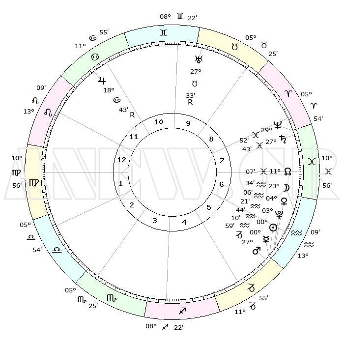 | | ΘΕΣΕΙΣ ΠΛΑΝΗΤΩΝ ΑΣΤΡΟΛΟΓΙΚΟΥ ΧΑΡΤΗ ΤΗΣ ΣΤΙΓΜΗΣ ΑΥΤΗΣ | | | | Πλανήτης | Ζώδιο | Μοίρες | Δεκαήμ. | Σε οίκο | Απόκλιση | | Ακμές των οίκων | | Ηλιος | Υδροχόος | 00°37' | Πρώτο | 6 | 20 S 01 | | 1ος | 09°15' | Λέων | | Σελήνη | Υδροχόος | 22°10' | Τρίτο | 7 | 15 S 34 | | 2ος | 01°01' | Παρθένος | | Ερμής | Αιγόκερως | 29°59' | Τρίτο | 6 | 22 S 08 | | 3ος | 27°19' | Παρθένος | | Αφροδίτη | Υδροχόος | 03°58' | Πρώτο | 6 | 20 S 22 | | 4ος | 29°19' | Ζυγός | | Αρης | Αιγόκερως | 27°54' | Τρίτο | 6 | 21 S 33 | | 5ος | 04°58' | Τοξότης | | Δίας | Καρκίνος | 18°44'R | Δεύτερο | 12 | 22 N 24 | | 6ος | 09°14' | Αιγόκερως | | Κρόνος | Ιχθείς | 27°43' | Τρίτο | 9 | 02 S 56 | | 7ος | 09°15' | Υδροχόος | | Ουρανός | Ταύρος | 27°33'R | Τρίτο | 10 | 19 N 25 | | 8ος | 01°01' | Ιχθείς | | Ποσειδώνας | Ιχθείς | 29°51' | Τρίτο | 9 | 01 S 16 | | 9ος | 27°19' | Ιχθείς | | Πλούτωνας | Υδροχόος | 03°20' | Πρώτο | 6 | 23 S 06 | | 10ος | 29°19' | Κριός | | Β. Δεσμός | Ιχθείς | 11°08' | Δεύτερο | 8 | 07 S 23 | | 11ος | 04°58' | Δίδυμοι | | Ωροσκόπος | Λέων | 09°15' | Πρώτο | | | 12ος | 09°14' | Καρκίνος | | Μεσουράνημα | Κριός | 29°19' | Τρίτο | | | |