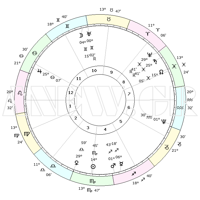 | | ΘΕΣΕΙΣ ΠΛΑΝΗΤΩΝ ΑΣΤΡΟΛΟΓΙΚΟΥ ΧΑΡΤΗ ΤΗΣ ΣΤΙΓΜΗΣ ΑΥΤΗΣ | | | | Πλανήτης | Ζώδιο | Μοίρες | Δεκαήμ. | Σε οίκο | Απόκλιση | | Ακμές των οίκων | | Ηλιος | Σκορπιός | 14°39' | Δεύτερο | 5 | 16 S 14 | | 1ος | 22°49' | Καρκίνος | | Σελήνη | Δίδυμοι | 02°48' | Πρώτο | 11 | 25 N 32 | | 2ος | 13°28' | Λέων | | Ερμής | Τοξότης | 06°16' | Πρώτο | 5 | 24 S 00 | | 3ος | 07°34' | Παρθένος | | Αφροδίτη | Ζυγός | 29°52' | Τρίτο | 4 | 10 S 07 | | 4ος | 07°37' | Ζυγός | | Αρης | Τοξότης | 01°39' | Πρώτο | 5 | 20 S 55 | | 5ος | 13°41' | Σκορπιός | | Δίας | Καρκίνος | 25°07' | Τρίτο | 1 | 21 N 12 | | 6ος | 20°36' | Τοξότης | | Κρόνος | Ιχθείς | 25°41'R | Τρίτο | 9 | 03 S 58 | | 7ος | 22°49' | Αιγόκερως | | Ουρανός | Δίδυμοι | 00°03'R | Πρώτο | 11 | 19 N 57 | | 8ος | 13°28' | Υδροχόος | | Ποσειδώνας | Ιχθείς | 29°41'R | Τρίτο | 9 | 01 S 23 | | 9ος | 07°34' | Ιχθείς | | Πλούτωνας | Υδροχόος | 01°30' | Πρώτο | 7 | 23 S 30 | | 10ος | 07°37' | Κριός | | Β. Δεσμός | Ιχθείς | 15°05' | Δεύτερο | 9 | 05 S 52 | | 11ος | 13°41' | Ταύρος | | Ωροσκόπος | Καρκίνος | 22°49' | Τρίτο | | | 12ος | 20°36' | Δίδυμοι | | Μεσουράνημα | Κριός | 07°37' | Πρώτο | | | |