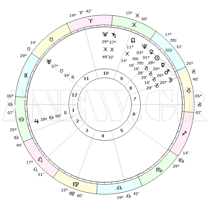 | | ΘΕΣΕΙΣ ΠΛΑΝΗΤΩΝ ΑΣΤΡΟΛΟΓΙΚΟΥ ΧΑΡΤΗ ΤΗΣ ΣΤΙΓΜΗΣ ΑΥΤΗΣ | | | | Πλανήτης | Ζώδιο | Μοίρες | Δεκαήμ. | Σε οίκο | Απόκλιση | | Ακμές των οίκων | | Ηλιος | Αιγόκερως | 28°24' | Τρίτο | 9 | 20 S 29 | | 1ος | 12°29' | Δίδυμοι | | Σελήνη | Αιγόκερως | 24°41' | Τρίτο | 8 | 24 S 46 | | 2ος | 05°06' | Καρκίνος | | Ερμής | Αιγόκερως | 26°22' | Τρίτο | 9 | 22 S 48 | | 3ος | 26°18' | Καρκίνος | | Αφροδίτη | Υδροχόος | 01°14' | Πρώτο | 9 | 20 S 56 | | 4ος | 20°13' | Λέων | | Αρης | Αιγόκερως | 26°13' | Τρίτο | 8 | 21 S 52 | | 5ος | 20°58' | Παρθένος | | Δίας | Καρκίνος | 19°01'R | Δεύτερο | 2 | 22 N 22 | | 6ος | 00°55' | Σκορπιός | | Κρόνος | Ιχθείς | 27°32' | Τρίτο | 11 | 03 S 00 | | 7ος | 12°29' | Τοξότης | | Ουρανός | Ταύρος | 27°35'R | Τρίτο | 12 | 19 N 26 | | 8ος | 05°06' | Αιγόκερως | | Ποσειδώνας | Ιχθείς | 29°49' | Τρίτο | 11 | 01 S 17 | | 9ος | 26°18' | Αιγόκερως | | Πλούτωνας | Υδροχόος | 03°16' | Πρώτο | 9 | 23 S 06 | | 10ος | 20°13' | Υδροχόος | | Β. Δεσμός | Ιχθείς | 11°15' | Δεύτερο | 10 | 07 S 21 | | 11ος | 20°58' | Ιχθείς | | Ωροσκόπος | Δίδυμοι | 12°29' | Δεύτερο | | | 12ος | 00°55' | Ταύρος | | Μεσουράνημα | Υδροχόος | 20°13' | Τρίτο | | | |