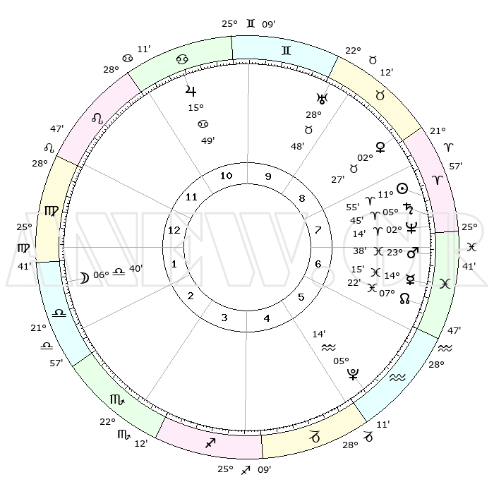 | | ΘΕΣΕΙΣ ΠΛΑΝΗΤΩΝ ΑΣΤΡΟΛΟΓΙΚΟΥ ΧΑΡΤΗ ΤΗΣ ΣΤΙΓΜΗΣ ΑΥΤΗΣ | | | | Πλανήτης | Ζώδιο | Μοίρες | Δεκαήμ. | Σε οίκο | Απόκλιση | | Ακμές των οίκων | | Ηλιος | Κριός | 11°52' | Δεύτερο | 8 | 04 N 41 | | 1ος | 09°45' | Παρθένος | | Σελήνη | Ζυγός | 05°59' | Πρώτο | 2 | 04 S 34 | | 2ος | 04°36' | Ζυγός | | Ερμής | Ιχθείς | 14°12' | Δεύτερο | 7 | 07 S 30 | | 3ος | 04°02' | Σκορπιός | | Αφροδίτη | Ταύρος | 02°23' | Πρώτο | 8 | 11 N 54 | | 4ος | 06°59' | Τοξότης | | Αρης | Ιχθείς | 23°35' | Τρίτο | 7 | 03 S 30 | | 5ος | 10°35' | Αιγόκερως | | Δίας | Καρκίνος | 15°49' | Δεύτερο | 11 | 22 N 52 | | 6ος | 11°54' | Υδροχόος | | Κρόνος | Κριός | 05°44' | Πρώτο | 8 | 00 N 19 | | 7ος | 09°45' | Ιχθείς | | Ουρανός | Ταύρος | 28°47' | Τρίτο | 9 | 19 N 43 | | 8ος | 04°36' | Κριός | | Ποσειδώνας | Κριός | 02°14' | Πρώτο | 7 | 00 S 19 | | 9ος | 04°02' | Ταύρος | | Πλούτωνας | Υδροχόος | 05°14' | Πρώτο | 5 | 22 S 47 | | 10ος | 06°59' | Δίδυμοι | | Β. Δεσμός | Ιχθείς | 07°22' | Πρώτο | 6 | 08 S 48 | | 11ος | 10°35' | Καρκίνος | | Ωροσκόπος | Παρθένος | 09°45' | Πρώτο | | | 12ος | 11°54' | Λέων | | Μεσουράνημα | Δίδυμοι | 06°59' | Πρώτο | | | |