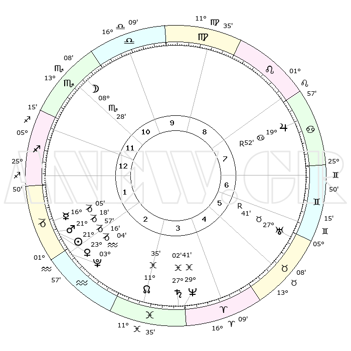 | | ΘΕΣΕΙΣ ΠΛΑΝΗΤΩΝ ΑΣΤΡΟΛΟΓΙΚΟΥ ΧΑΡΤΗ ΤΗΣ ΣΤΙΓΜΗΣ ΑΥΤΗΣ | | | | Πλανήτης | Ζώδιο | Μοίρες | Δεκαήμ. | Σε οίκο | Απόκλιση | | Ακμές των οίκων | | Ηλιος | Αιγόκερως | 21°48' | Τρίτο | 3 | 21 S 40 | | 1ος | 13°32' | Σκορπιός | | Σελήνη | Σκορπιός | 06°47' | Πρώτο | 12 | 17 S 49 | | 2ος | 12°53' | Τοξότης | | Ερμής | Αιγόκερως | 15°51' | Δεύτερο | 2 | 24 S 04 | | 3ος | 16°11' | Αιγόκερως | | Αφροδίτη | Αιγόκερως | 23°05' | Τρίτο | 3 | 22 S 20 | | 4ος | 21°21' | Υδροχόος | | Αρης | Αιγόκερως | 21°11' | Τρίτο | 3 | 22 S 42 | | 5ος | 23°52' | Ιχθείς | | Δίας | Καρκίνος | 19°53'R | Δεύτερο | 9 | 22 N 13 | | 6ος | 21°05' | Κριός | | Κρόνος | Ιχθείς | 27°01' | Τρίτο | 5 | 03 S 14 | | 7ος | 13°32' | Ταύρος | | Ουρανός | Ταύρος | 27°41'R | Τρίτο | 7 | 19 N 27 | | 8ος | 12°53' | Δίδυμοι | | Ποσειδώνας | Ιχθείς | 29°41' | Τρίτο | 5 | 01 S 21 | | 9ος | 16°11' | Καρκίνος | | Πλούτωνας | Υδροχόος | 03°04' | Πρώτο | 3 | 23 S 09 | | 10ος | 21°21' | Λέων | | Β. Δεσμός | Ιχθείς | 11°35' | Δεύτερο | 4 | 07 S 13 | | 11ος | 23°52' | Παρθένος | | Ωροσκόπος | Σκορπιός | 13°32' | Δεύτερο | | | 12ος | 21°05' | Ζυγός | | Μεσουράνημα | Λέων | 21°21' | Τρίτο | | | |