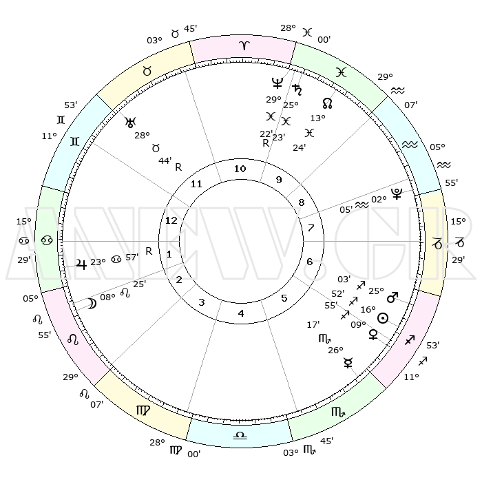 | | ΘΕΣΕΙΣ ΠΛΑΝΗΤΩΝ ΑΣΤΡΟΛΟΓΙΚΟΥ ΧΑΡΤΗ ΤΗΣ ΣΤΙΓΜΗΣ ΑΥΤΗΣ | | | | Πλανήτης | Ζώδιο | Μοίρες | Δεκαήμ. | Σε οίκο | Απόκλιση | | Ακμές των οίκων | | Ηλιος | Τοξότης | 16°49' | Δεύτερο | 6 | 22 S 47 | | 1ος | 01°01' | Καρκίνος | | Σελήνη | Λέων | 07°47' | Πρώτο | 2 | 21 N 08 | | 2ος | 21°45' | Καρκίνος | | Ερμής | Σκορπιός | 26°14' | Τρίτο | 6 | 17 S 07 | | 3ος | 13°37' | Λέων | | Αφροδίτη | Τοξότης | 09°51' | Πρώτο | 6 | 21 S 31 | | 4ος | 10°06' | Παρθένος | | Αρης | Τοξότης | 25°01' | Τρίτο | 6 | 24 S 04 | | 5ος | 14°12' | Ζυγός | | Δίας | Καρκίνος | 23°58'R | Τρίτο | 2 | 21 N 29 | | 6ος | 24°07' | Σκορπιός | | Κρόνος | Ιχθείς | 25°23' | Τρίτο | 10 | 03 S 59 | | 7ος | 01°01' | Αιγόκερως | | Ουρανός | Ταύρος | 28°44'R | Τρίτο | 12 | 19 N 40 | | 8ος | 21°45' | Αιγόκερως | | Ποσειδώνας | Ιχθείς | 29°22'R | Τρίτο | 10 | 01 S 29 | | 9ος | 13°37' | Υδροχόος | | Πλούτωνας | Υδροχόος | 02°05' | Πρώτο | 8 | 23 S 22 | | 10ος | 10°06' | Ιχθείς | | Β. Δεσμός | Ιχθείς | 13°24' | Δεύτερο | 10 | 06 S 31 | | 11ος | 14°12' | Κριός | | Ωροσκόπος | Καρκίνος | 01°01' | Πρώτο | | | 12ος | 24°07' | Ταύρος | | Μεσουράνημα | Ιχθείς | 10°06' | Δεύτερο | | | |