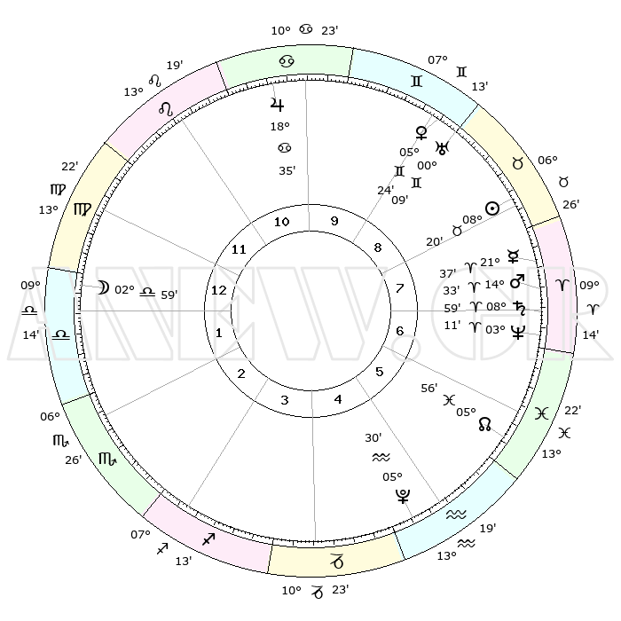 | | ΘΕΣΕΙΣ ΠΛΑΝΗΤΩΝ ΑΣΤΡΟΛΟΓΙΚΟΥ ΧΑΡΤΗ ΤΗΣ ΣΤΙΓΜΗΣ ΑΥΤΗΣ | | | | Πλανήτης | Ζώδιο | Μοίρες | Δεκαήμ. | Σε οίκο | Απόκλιση | | Ακμές των οίκων | | Ηλιος | Ταύρος | 08°16' | Πρώτο | 8 | 14 N 15 | | 1ος | 19°22' | Παρθένος | | Σελήνη | Ζυγός | 02°08' | Πρώτο | 1 | 02 S 49 | | 2ος | 15°07' | Ζυγός | | Ερμής | Κριός | 21°30' | Τρίτο | 8 | 06 N 22 | | 3ος | 15°06' | Σκορπιός | | Αφροδίτη | Δίδυμοι | 05°20' | Πρώτο | 9 | 21 N 58 | | 4ος | 18°01' | Τοξότης | | Αρης | Κριός | 14°30' | Δεύτερο | 7 | 04 N 53 | | 5ος | 21°14' | Αιγόκερως | | Δίας | Καρκίνος | 18°35' | Δεύτερο | 10 | 22 N 32 | | 6ος | 22°04' | Υδροχόος | | Κρόνος | Κριός | 08°59' | Πρώτο | 7 | 01 N 34 | | 7ος | 19°22' | Ιχθείς | | Ουρανός | Δίδυμοι | 00°09' | Πρώτο | 9 | 20 N 01 | | 8ος | 15°07' | Κριός | | Ποσειδώνας | Κριός | 03°11' | Πρώτο | 7 | 00 N 03 | | 9ος | 15°06' | Ταύρος | | Πλούτωνας | Υδροχόος | 05°30' | Πρώτο | 5 | 22 S 48 | | 10ος | 18°01' | Δίδυμοι | | Β. Δεσμός | Ιχθείς | 05°57' | Πρώτο | 6 | 09 S 20 | | 11ος | 21°14' | Καρκίνος | | Ωροσκόπος | Παρθένος | 19°22' | Δεύτερο | | | 12ος | 22°04' | Λέων | | Μεσουράνημα | Δίδυμοι | 18°01' | Δεύτερο | | | |