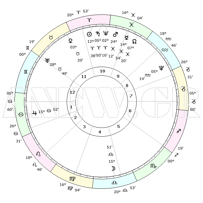 | | ΘΕΣΕΙΣ ΠΛΑΝΗΤΩΝ ΑΣΤΡΟΛΟΓΙΚΟΥ ΧΑΡΤΗ ΤΗΣ ΣΤΙΓΜΗΣ ΑΥΤΗΣ | | | | Πλανήτης | Ζώδιο | Μοίρες | Δεκαήμ. | Σε οίκο | Απόκλιση | | Ακμές των οίκων | | Ηλιος | Κριός | 12°34' | Δεύτερο | 11 | 04 N 58 | | 1ος | 15°05' | Δίδυμοι | | Σελήνη | Ζυγός | 15°05' | Δεύτερο | 5 | 08 S 47 | | 2ος | 07°20' | Καρκίνος | | Ερμής | Ιχθείς | 14°51' | Δεύτερο | 10 | 07 S 21 | | 3ος | 28°33' | Καρκίνος | | Αφροδίτη | Ταύρος | 03°16' | Πρώτο | 11 | 12 N 14 | | 4ος | 22°46' | Λέων | | Αρης | Ιχθείς | 24°09' | Τρίτο | 11 | 03 S 17 | | 5ος | 24°01' | Παρθένος | | Δίας | Καρκίνος | 15°52' | Δεύτερο | 2 | 22 N 52 | | 6ος | 04°08' | Σκορπιός | | Κρόνος | Κριός | 05°49' | Πρώτο | 11 | 00 N 21 | | 7ος | 15°05' | Τοξότης | | Ουρανός | Ταύρος | 28°49' | Τρίτο | 12 | 19 N 43 | | 8ος | 07°20' | Αιγόκερως | | Ποσειδώνας | Κριός | 02°16' | Πρώτο | 11 | 00 S 18 | | 9ος | 28°33' | Αιγόκερως | | Πλούτωνας | Υδροχόος | 05°14' | Πρώτο | 9 | 22 S 47 | | 10ος | 22°46' | Υδροχόος | | Β. Δεσμός | Ιχθείς | 07°20' | Πρώτο | 10 | 08 S 49 | | 11ος | 24°01' | Ιχθείς | | Ωροσκόπος | Δίδυμοι | 15°05' | Δεύτερο | | | 12ος | 04°08' | Ταύρος | | Μεσουράνημα | Υδροχόος | 22°46' | Τρίτο | | | |